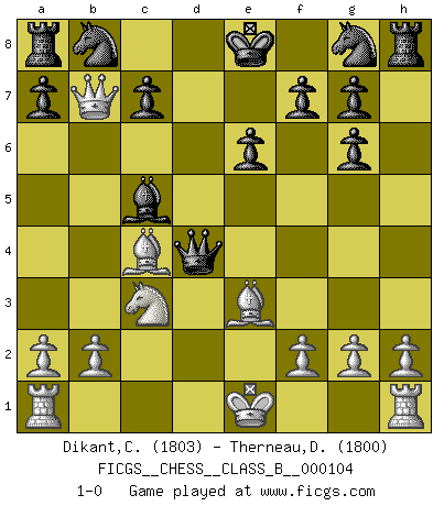 Last move : 1-0 2010 August 11 22:35:15 [Event "FICGS__CHESS__CLASS_B__000104"] [Site "FICGS"] [Date "2010.03.26"] [Round "1"] [White "Dikant,Christophe"] [Black "Therneau,David"] [Result "1-0"] [WhiteElo "1803"] [BlackElo "1800"] 1.d4 d5 2.Nf3 Bg4 3.Ne5 Bf5 4.c4 dxc4 5.e4 Bxe4 6.Nc3 Bg6 7.Bxc4 e6 8.Qb3 Qxd4 9.Nxg6 hxg6 10.Qxb7 Bc5 11.Be3 1-0 Queen's pawn game Player White won this chess game. Follow this game move after move (download)Many Chess players were surprised when after the game, Fischer quietly explained: 'I had already analyzed this possibility' in a position which I thought was not possible to foresee from the opening. (Mikhail Tal) Wie kann ich Remis annehmen? Ich weiß ja gar nicht, wie ich stehe! (Fritz Sämisch) Debemos de asegurarnos de que el Ajedrez no se convierta en un lenguaje muerto, muy interesante, pero solo para un grupo muy pequeño. (Sytze Faber) A ce moment-là, je menaçais de comprendre la position ! (Clément L'Heureux) Experiences are the keys to life. (Daniel Parmet)
