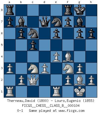 Last move : 0-1 2010 July 8 9:18:56 [Event "FICGS__CHESS__CLASS_B__000104"] [Site "FICGS"] [Date "2010.03.26"] [Round "1"] [White "Therneau,David"] [Black "Louro,Eugenio"] [Result "0-1"] [WhiteElo "1800"] [BlackElo "1855"] 1.c4 c5 2.Nc3 Nc6 3.Nf3 g6 4.g3 Bg7 5.Bg2 e6 6.O-O Nge7 7.Re1 O-O 8.a3 b6 9.e3 Bb7 10.Qc2 d5 11.cxd5 Nxd5 12.e4 Nde7 13.d3 Qd7 14.Bf4 h6 0-1 This chess game has been lost on time (started : 2010.03.26 14:58:49) English : Symmetrical variation Kingside Castling by player White (move 6) Kingside Castling by player Black (move 7) Player Black won this chess game. Follow this game move after move (download)A good sacrifice is one that is not necessarily sound but leaves your opponent dazed and confused. (Rudolph Spielmann) Ein Buch ist ein Spiegel; wenn ein Affe hineinsieht, so kann kein Apostel heraus gucken. (Georg Christoph Lichtenberg) Los errores estan ahí, esperando a que se cometan. (Savielly Tartakower) Pour se monter efficace, un Cavalier a besoin d'avant-postes ! Les Cavaliers font les meilleurs bloqueurs de pions passés. When a man with money meets a man with experience, the man with experience leaves with money and the man with money leaves with experience. (Anonymous)