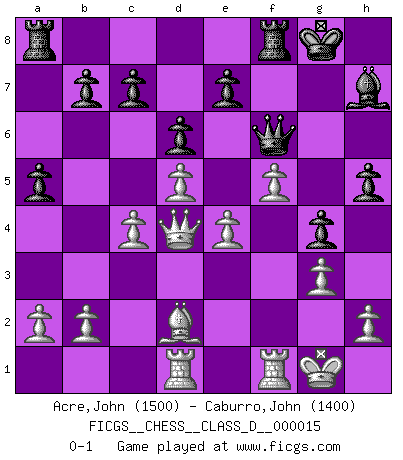 Last move : 0-1 2007 January 27 1:19:39 [Event "FICGS__CHESS__CLASS_D__000015"] [Site "FICGS"] [Date "2006.10.23"] [Round "1"] [White "Acre,John"] [Black "Caburro,John"] [Result "0-1"] [WhiteElo "1500"] [BlackElo "1400"] 1.d4 f5 2.g3 Nf6 3.Bg2 g6 4.Nf3 Bg7 5.O-O O-O 6.c4 d6 7.Nc3 Qe8 8.d5 Na6 9.Rb1 Nc5 10.Nb5 Qd8 11.Nbd4 a5 12.Ng5 h6 13.Nh3 g5 14.f4 g4 15.Nf2 h5 16.Qc2 Nh7 17.Be3 Bd7 18.Nd3 Ne4 19.Bxe4 fxe4 20.Nf2 Nf6 21.Nxe4 Nxe4 22.Qxe4 Bxd4 23.Qxd4 Bf5 24.Rbd1 Qe8 25.Bd2 Qf7 26.e4 Bh7 27.f5 Qf6 0-1 Dutch defense Kingside Castling by player White (move 5) Kingside Castling by player Black (move 5) Player Black won this chess game. Follow this game move after move (download)One bad move nullifies forty good ones. (Horowitz) Kein Schachspieler kann gut schlafen. (H. G. Wells) Cada Peón es una Reina en potencia. (James Mason) Karpov est une pièce de musée. (Garry Kasparov) When the going gets tactical, the computers get going. (Hyatt)