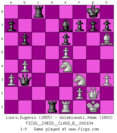 Last move : 1-0 2010 November 20 10:34:18 [Event "FICGS__CHESS__CLASS_B__000104"] [Site "FICGS"] [Date "2010.03.26"] [Round "1"] [White "Louro,Eugenio"] [Black "Golebiowski,Adam"] [Result "1-0"] [WhiteElo "1855"] [BlackElo "1800"] 1.Nf3 Nf6 2.g3 e6 3.Bg2 d5 4.d4 Be7 5.O-O O-O 6.b3 b6 7.c4 c6 8.Bb2 Ba6 9.Nbd2 Nbd7 10.Re1 Rc8 11.e4 Bb7 12.e5 Ne8 13.Qc2 Qc7 14.Rac1 Qb8 15.h3 Nc7 16.Bf1 Rfd8 17.Bd3 Nf8 18.Qd1 c5 19.Qe2 Qa8 20.dxc5 Bxc5 21.cxd5 Nxd5 22.a3 Ng6 23.Be4 Ndf4 24.gxf4 Nxf4 25.Qf1 Bxe4 26.Nxe4 Nd3 27.Rb1 Nxe1 28.Rxe1 Qd5 29.b4 Be7 30.Qg2 Qb3 31.Bc1 Rd1 32.Bh6 1-0 Reti Opening Kingside Castling by player White (move 5) Kingside Castling by player Black (move 5) Player White won this chess game. Follow this game move after move (download)Nowadays, when you're not a grandmaster at 14, you can forget about it. (Anand Viswanathan) Ein Gewinn durch eine ungenaue Kombination, sei sie auch noch so vorzeigbar, erfüllt mich mit Schaudern. (Wilhelm Steinitz) Yo considero que Fischer es uno de los expertos mas grandes de aperturas de siempre. (Keith Hayward) Ne tendez aucun piège pour le plaisir ! Ne jouez rien dans l'espoir que l'adversaire réagisse de façon stupide ! Prenez toujours pour acquis que l'adversaire va trouver le meilleur coup ! Ne jouez jamais de coup dans l'espoir que l'adversaire ne voie pas la menace ! Chacun de vos coups doit améliorer la position d'une façon ou d'une autre. You must have a dream in order to have it come true. (A.P.J. Kalam)