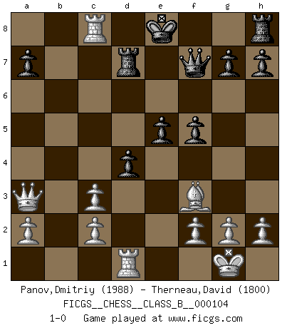 Last move : 1-0 2010 April 20 21:9:33 [Event "FICGS__CHESS__CLASS_B__000104"] [Site "FICGS"] [Date "2010.03.26"] [Round "1"] [White "Panov,Dmitriy"] [Black "Therneau,David"] [Result "1-0"] [WhiteElo "1988"] [BlackElo "1800"] 1.e4 Nf6 2.e5 Nd5 3.d4 d6 4.Nf3 Bg4 5.Be2 Nc6 6.O-O Bxf3 7.Bxf3 dxe5 8.Nc3 Nxc3 9.bxc3 Qd6 10.Rb1 O-O-O 11.Qe2 exd4 12.Qb5 Kd7 13.Rd1 e5 14.Qa4 f5 15.Rxb7 Be7 16.Ba3 Qg6 17.Bxe7 Kxe7 18.Rxc7+ Rd7 19.Rxc6 Qf7 20.Qa3+ Ke8 21.Rc8+ 1-0 Alekhine's defense : Modern variation, 4...Bg4 Kingside Castling by player White (move 6) Queenside Castling by player Black (move 10) Player White won this chess game. Follow this game move after move (download)It is the aim of the modern school, not to treat every position according to one general law, but according to the principle inherent in the position. (Richard Reti) Ich glaube nicht an Psychologie, ich glaube an gute Züge. (Robert James Fischer) Por esta medida (el intervalo entre Fischer y sus contemporaneos), yo le considero el mas grande campeón mundial. (Garry Kasparov) L'ordinateur a tué l'originalité. Il n'y a plus guère d'aventures sur l'échiquier. (Jacob Murray) The weakness of an artist is dogma. (Josh Waitzkin)
