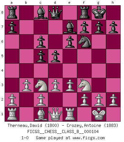 Last move : 1-0 2010 May 12 19:51:9 [Event "FICGS__CHESS__CLASS_B__000104"] [Site "FICGS"] [Date "2010.03.26"] [Round "1"] [White "Therneau,David"] [Black "Crozey,Antoine"] [Result "1-0"] [WhiteElo "1800"] [BlackElo "1883"] 1.Nc3 c5 2.Nf3 d5 3.e3 Nc6 4.Bb5 Nf6 5.Bxc6+ bxc6 6.O-O e6 7.Re1 Be7 8.d3 O-O 9.b3 1-0 This chess game has been lost on time (started : 2010.03.26 14:58:49) Dunst (Sleipner, Heinrichsen) Opening Kingside Castling by player White (move 6) Kingside Castling by player Black (move 8) Player White won this chess game. Follow this game move after move (download)Man is a frivolous, a specious creature, and like a Chess player, cares more for the process of attaining his goal than for the goal itself. (Dostoyevsky) Wenn du auf das Glück wartest, wird das Leben ziemlich langweilig. (Mikhail Nekhemyevich Tal) Juega la Apertura como un libro, el Juego Medio como un mago y los Finales como una máquina. (Spielmann) À la honte des hommes, on sait que les lois du jeu sont les seules qui soient partout justes, claires, inviolables et exécutées. Pourquoi l'Indien qui a donné les règles du jeu d'échecs est-il obéi de bon gré dans toute la terre, et que les décrétales des papes, par exemple, sont aujourd'hui un objet d'horreur et de mépris ? C'est que l'inventeur des échecs combina tout avec justesse pour la satisfaction des joueurs, et que les papes, dans leurs décrétales, n'eurent en vue que leur seul avantage. L'Indien voulut exercer également l'esprit des hommes et leur donner du plaisir; les papes ont voulu abrutir l'esprit des hommes. Voltaire (Dictionnaire philosophique / Garnier 1967) Yoga is 99% practice and 1% knowledge. (Sri Krishna Pattabhi Jois)