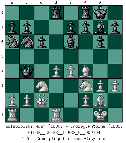 Last move : 1-0 2010 June 3 8:56:29 [Event "FICGS__CHESS__CLASS_B__000104"] [Site "FICGS"] [Date "2010.03.26"] [Round "1"] [White "Golebiowski,Adam"] [Black "Crozey,Antoine"] [Result "1-0"] [WhiteElo "1800"] [BlackElo "1883"] 1.d4 d5 2.Nf3 Nf6 3.g3 c6 4.c4 dxc4 5.Qc2 g6 6.Qxc4 Be6 7.Qa4 Bg7 8.Bg2 O-O 9.O-O Na6 10.Nc3 Qb6 11.e4 Rad8 12.h3 Nd7 13.Rd1 Qb4 14.Qc2 Nb6 15.Bf4 1-0 Queen's pawn game Kingside Castling by player Black (move 8) Kingside Castling by player White (move 9) Player White won this chess game. Follow this game move after move (download)The passed pawn is a criminal, who should be kept under lock and key. Mild measures, such as police surveillance, are not sufficient. (Nimzovitch) Es ist peinlich, dass ich nie Weltmeister wurde. Es wäre leicht, Leonid Breschnjew als Ursache vorzuschieben, dessen Apparat den Vorzeigekommunisten Anatoli Karpow in allem unterstützte. Aber Garri Kasparow zum Beispiel, der ebenfalls von den Sowjets unerwünscht war, hat trotz der Widerstände den WM-Titel erobert. (Viktor Kortschnoi) Si no le temes a Spassky, entonces elimino el elemento del dinero. (Jim Slater) Karpov est une pièce de musée. (Garry Kasparov) Fear is the path to the dark side. Fear leads to anger; anger leads to hate; hate leads to suffering. I sense much fear in you. (Master Yoda in Star Wars ep.1)