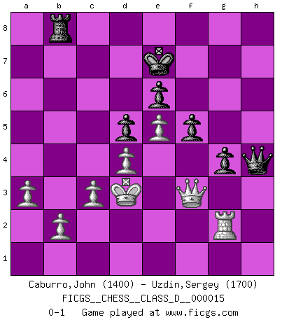 Last move : 0-1 2007 April 25 18:41:4 [Event "FICGS__CHESS__CLASS_D__000015"] [Site "FICGS"] [Date "2006.10.23"] [Round "1"] [White "Caburro,John"] [Black "Uzdin,Sergey"] [Result "0-1"] [WhiteElo "1400"] [BlackElo "1700"] 1.d4 d5 2.Nf3 Nf6 3.Bf4 e6 4.e3 Be7 5.Bd3 O-O 6.h3 c5 7.c3 Nbd7 8.Nbd2 b6 9.O-O Bb7 10.Qe2 h6 11.Ne5 Rc8 12.f3 Nh5 13.Bh2 Nxe5 14.Bxe5 Bh4 15.g4 Ng3 16.Bxg3 Bxg3 17.Qg2 Bb8 18.f4 Qe7 19.Rf2 f6 20.Raf1 Bd6 21.Nf3 a6 22.Nh4 Rfe8 23.Ng6 Qf7 24.g5 f5 25.gxh6 Kh7 26.Ne5 Bxe5 27.fxe5 g6 28.Qg3 Kxh6 29.Rg2 Kg7 30.Be2 Rh8 31.Kf2 Rcg8 32.Rfg1 Kf8 33.Qg5 cxd4 34.exd4 Rxh3 35.Qd8+ Qe8 36.Qxb6 Qe7 37.Bxa6 Qh4+ 38.Ke2 Bxa6+ 39.Qxa6 Rh2 40.Qd3 g5 41.Qf3 Ke7 42.Rxh2 Qxh2+ 43.Rg2 Qh1 44.Qf1 Qh4 45.Qf3 Ra8 46.a3 Rb8 47.Kd3 g4 0-1 Queen's Bishop game Kingside Castling by player Black (move 5) Kingside Castling by player White (move 9) Player Black won this chess game. Follow this game move after move (download)Nothing excites jaded Grandmasters more than a theoretical novelty. (Dominic Lawson) Auf Remis zu spielen ist gewissermaßen ein Verbrechen gegen das Schachspiel. (Mikhail Nekhemyevich Tal) El Ajedrez es tortura mental. (Garry Kasparov) Il n'y a pas de prix trop élevé au scalp de l'ennemi. (Koblentz) That's absurd. I love it. (Gregory House, House M.D.)
