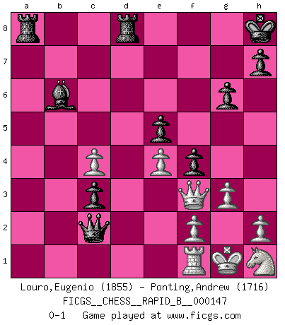 Last move : 0-1 2010 August 3 23:43:8 [Event "FICGS__CHESS__RAPID_B__000147"] [Site "FICGS"] [Date "2010.03.26"] [Round "1"] [White "Louro,Eugenio"] [Black "Ponting,Andrew"] [Result "0-1"] [WhiteElo "1855"] [BlackElo "1716"] 1.b4 e5 2.a3 d5 3.Bb2 Bd6 4.Nf3 Qe7 5.e3 Nf6 6.c4 c6 7.Nc3 d4 8.c5 Bc7 9.Ne2 O-O 10.Ng3 b6 11.cxb6 axb6 12.Qc2 c5 13.bxc5 bxc5 14.Bd3 Bb7 15.Ng5 g6 16.O-O Nc6 17.N5e4 Nd7 18.Bc4 Kh8 19.d3 f5 20.Nd2 Nb6 21.Bb3 Rfd8 22.e4 f4 23.Nh1 Na5 24.Ba2 Bd6 25.Rab1 c4 26.dxc4 Bc5 27.Rfe1 Bc6 28.Qd3 Na4 29.Bc1 Nc3 30.Ra1 Nb7 31.Nb1 Bb6 32.Nxc3 dxc3 33.Qf3 Nc5 34.Bb1 Ba4 35.Ra2 Bb3 36.Rc2 Nd3 37.Rf1 Bxc2 38.Bxc2 Nxc1 39.Rxc1 Qxa3 40.Rf1 Qb2 41.g3 Qxc2 0-1 Polish (Sokolsky) opening Kingside Castling by player Black (move 9) Kingside Castling by player White (move 16) Player Black won this chess game. Follow this game move after move (download)Pawns are born free, yet they are everywhere in chains. (Rick Kennedy) Kasparov ist eine Art Monster mit hundert Augen, denen auch nicht das Geringste entgeht. (Tony Miles) Cuando la partida de Ajedrez termina, el Peón y el Rey regresan a la misma caja. (Irish saying) Aucun coup ne doit être joué sans but. (Pedro Damiano) It's not the will to win, but the will to prepare to win that makes the difference. (Bear Bryant)
