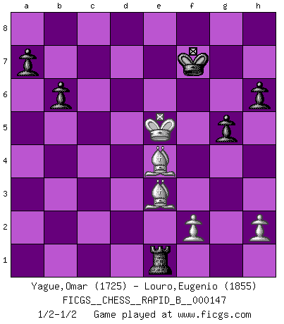 Last move : 1/2-1/2 2010 August 2 17:45:48 [Event "FICGS__CHESS__RAPID_B__000147"] [Site "FICGS"] [Date "2010.03.26"] [Round "1"] [White "Yague,Omar"] [Black "Louro,Eugenio"] [Result "1/2-1/2"] [WhiteElo "1725"] [BlackElo "1855"] 1.Nf3 c5 2.c4 Nc6 3.Nc3 Nf6 4.d3 d5 5.cxd5 Nxd5 6.Nxd5 Qxd5 7.e4 Qd6 8.Be3 e5 9.Rc1 b6 10.Be2 Be7 11.O-O Be6 12.a3 O-O 13.Ng5 Bxg5 14.Bxg5 Nd4 15.Rc3 f6 16.Be3 f5 17.exf5 Bxf5 18.Bg4 Bg6 19.Re1 Rae8 20.Kh1 Bf7 21.Qa4 Qg6 22.Qd1 Bd5 23.Rg1 Rd8 24.b4 cxb4 25.axb4 Nc6 26.Bh5 Qd6 27.Qa4 Qxb4 28.Qxb4 Nxb4 29.Rb1 Nxd3 30.Rxd3 Bxg2+ 31.Kxg2 Rxd3 32.Rb5 Rd6 33.Rxe5 Rfd8 34.Be2 h6 35.Bc4+ Kh7 36.Kf3 Rc8 37.Bb5 Ra8 38.Ba6 Rad8 39.Ke4 Rd1 40.Re7 R1d7 41.Rxd7 Rxd7 42.Bd4 Rc7 43.Bd3 Rc1 44.Kd5 Kg8 45.Bf5 Rd1 46.Ke5 Kf7 47.Be4 g5 48.Be3 Re1 1/2-1/2 Reti Opening Kingside Castling by player White (move 11) Kingside Castling by player Black (move 12) This chess game ended in a draw. Follow this game move after move (download)It is peculiar but a fact nevertheless, that gamblers in chess always have enthusiastic followers. (Botvinnik) Die FIDE ist dabei in die Hände der russischen Mafia zu fallen. (Larry Evans) Te sientas frente a un tablero y repentinamente tu corazón brinca. Tu mano tiembla al tomar una pieza y moverla. Pero lo que el Ajedrez te enseña es que tu debes permanecer ahí con calma y pensar de que si realmente es una buena idea o de que si hay otras ideas mejores. (Stanley Kubrick) RxDa4 pat (...) The problem with manipulation is that people can turn on you. (Horatio Caine, C.S.I. Miami)