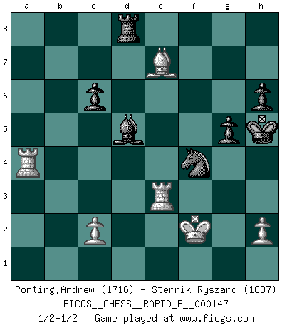 Last move : 1/2-1/2 2010 June 17 20:20:14 [Event "FICGS__CHESS__RAPID_B__000147"] [Site "FICGS"] [Date "2010.03.26"] [Round "1"] [White "Ponting,Andrew"] [Black "Sternik,Ryszard"] [Result "1/2-1/2"] [WhiteElo "1716"] [BlackElo "1887"] 1.e4 e5 2.Nf3 Nc6 3.Bb5 a6 4.Ba4 Nf6 5.O-O Nxe4 6.Re1 Nc5 7.Bxc6 dxc6 8.d4 Ne6 9.Nxe5 Bd6 10.Nc3 O-O 11.Ne4 Bxe5 12.dxe5 Qh4 13.Bd2 h6 14.Ng3 f5 15.exf6 Qxf6 16.Ne4 Qxb2 17.Bc3 Qb5 18.Qg4 Qf5 19.Qg3 Rf7 20.Rad1 Qf4 21.Qxf4 Rxf4 22.Rd3 b6 23.Rg3 Kf7 24.Rge3 Rf5 25.Nd2 Rd5 26.f4 b5 27.g4 b4 28.Bxb4 Nxf4 29.Re4 g5 30.Nc4 Bxg4 31.Ne5+ Rxe5 32.Rxe5 Rd8 33.Re7+ Kg6 34.Rxc7 Bf3 35.Kf2 Bd5 36.Ra7 Bc4 37.Re4 Bxa2 38.Rxa6 Bd5 39.Re5 Kh5 40.Re3 Rb8 41.Ra4 Rd8 42.Be7 1/2-1/2 Ruy Lopez : Open (Tarrasch) defense Kingside Castling by player White (move 5) Kingside Castling by player Black (move 10) This chess game ended in a draw. Follow this game move after move (download)Fischer wanted to give the Russians a taste of their own medicine. (Larry Evans) Wenn du gegen Bobby spielst, ist es keine Frage von gewinnen oder verlieren. Es ist eine Frage des Überlebens. (Boris Vassilievich Spassky) Yo adoro todas la posiciones. Denme una partida posicional difícil, y la jugaré. Pero posiciones totalmente ganadas, no las tolero. (Hein Donner) Pour se monter efficace, un Cavalier a besoin d'avant-postes ! Les Cavaliers font les meilleurs bloqueurs de pions passés. Man with more than one clock never knows what time it is. (Chinese thought)