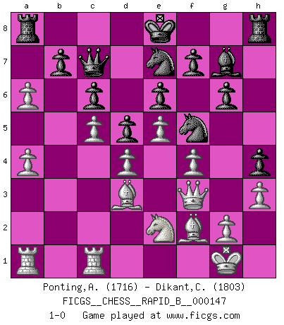 Last move : 1-0 2010 August 18 10:44:24 [Event "FICGS__CHESS__RAPID_B__000147"] [Site "FICGS"] [Date "2010.03.26"] [Round "1"] [White "Ponting,Andrew"] [Black "Dikant,Christophe"] [Result "1-0"] [WhiteElo "1716"] [BlackElo "1803"] 1.e4 g6 2.d4 Bg7 3.Nc3 c6 4.f4 d5 5.e5 h5 6.Be3 Nh6 7.Nf3 Bg4 8.h3 Bxf3 9.Qxf3 Nf5 10.Bf2 h4 11.Bd3 e6 12.O-O Nd7 13.Ne2 Bf8 14.b3 Be7 15.c4 Qc7 16.a3 a6 17.Rfc1 Nb6 18.c5 Nc8 19.b4 Bf8 20.a4 Bg7 21.b5 Nce7 22.bxa6 1-0 This chess game has been lost on time (started : 2010.03.26 22:59:29) Robatsch defense : Gurgenidze variation Kingside Castling by player White (move 12) Player White won this chess game. Follow this game move after move (download)Pawns: they are the soul of this game, they alone form the attack and defense. (Philidor) Stil? Ich habe keinen Stil! (Anatoly Karpov) El Ajedrez, como cualquier actividad creativa, solo puede existir a través del esfuerzo combinado de aquellos que tienen talento creativo y de aquellos que poseen la habilidad de organizar su trabajo creativo. (Mikhail Botvinnik) Seul un grand joueur sait à quel point il joue faiblement. (Xavier Tartacover) If you don't practice you don't deserve to win. (Andre Agassi)