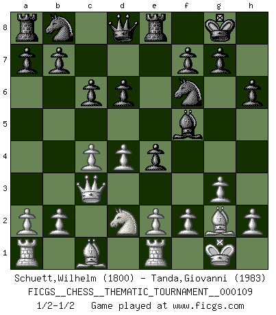Last move : 1/2-1/2 2010 May 10 8:10:11 [Event "FICGS__CHESS__THEMATIC_TOURNAMENT__000109"] [Site "FICGS"] [Date "2010.03.27"] [Round "1"] [White "Schuett,Wilhelm"] [Black "Tanda,Giovanni"] [Result "1/2-1/2"] [WhiteElo "1800"] [BlackElo "1983"] 1.c4 e5 2.g3 Nf6 3.Bg2 h6 4.Nc3 Bb4 5.Qb3 Bxc3 6.Qxc3 d6 7.Nf3 O-O 8.d4 e4 9.Nd2 Re8 10.O-O Bf5 11.Re1 c6 1/2-1/2 English Opening Kingside Castling by player Black (move 7) Kingside Castling by player White (move 10) This chess game ended in a draw. Follow this game move after move (download)If your opponent cannot do anything active, then don't rush the position; instead you should let him sit there, suffer, and beg you for a draw. (Jeremy Silman) Ich bin der einzige Schachspieler, der sich während der Vorbereitungen zum Turnier verletzt hat. (Woody Allen) Nada excita más a Grandes Maestros aburridos que una novedad teórica. (Dominic Lawson) Toutes les manuvres exécutées sur une colonne ouverte ont pour but ultime l'intrusion définitive sur la septième ou la huitième rangée, en plein cur de la position ennemie. (Aaron Nimzovitch) Fame, I have already. Now I need the money. (an elderly Steinitz)