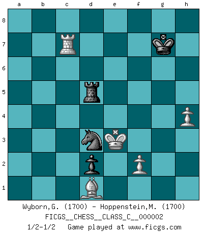 Last move : 1/2-1/2 2006 October 9 6:55:9 [Event "FICGS__CHESS__CLASS_C__000002"] [Site "FICGS"] [Date "2006.04.26"] [Round "1"] [White "Wyborn,Graham"] [Black "Hoppenstein,Michael"] [Result "1/2-1/2"] [WhiteElo "1700"] [BlackElo "1700"] 1.d4 Nf6 2.c4 e6 3.Nc3 c5 4.d5 exd5 5.cxd5 d6 6.e4 g6 7.Nf3 a6 8.a4 Bg4 9.Be2 Bxf3 10.Bxf3 Nbd7 11.O-O Bg7 12.Bf4 Qe7 13.a5 O-O 14.Re1 Rfe8 15.Ra4 b5 16.axb6 Nxb6 17.Ra1 Nfd7 18.Qc1 Bd4 19.Ne2 Bf6 20.Ng3 Bd4 21.Rb1 Ne5 22.Be2 Rab8 23.b3 h5 24.Bg5 f6 25.Be3 h4 26.Nf1 f5 27.exf5 gxf5 28.Bxd4 cxd4 29.Qf4 d3 30.Bf3 Qf6 31.Ne3 Rf8 32.h3 Nbd7 33.Nc4 Rb4 34.Qd2 Rfb8 35.Nxe5 dxe5 36.Rec1 e4 37.Bd1 Ne5 38.Rc5 R4b5 39.Rbc1 Rxc5 40.Rxc5 f4 41.b4 Re8 42.Kh1 f3 43.d6 fxg2+ 44.Kxg2 Kh7 45.Kf1 Kg7 46.Rc7+ Kh8 47.Qe3 Qxd6 48.Rb7 d2 49.Qf4 Re6 50.Qxh4+ Rh6 51.Qxe4 Qd3+ 52.Qxd3 Nxd3 53.Ke2 Rd6 54.b5 axb5 55.Rxb5 Nc1+ 56.Ke3 Rd3+ 57.Ke4 Rd7 58.h4 Na2 59.Rb3 Nc1 60.Rb2 Nd3 61.Rb8+ Kg7 62.Ke3 Ne5 63.Rb4 Nd3 64.Rb3 Nc5 65.Rc3 Rd5 66.Rc4 Nd3 67.Rc7+ 1/2-1/2 Queen's pawn game Kingside Castling by player White (move 11) Kingside Castling by player Black (move 13) 10 pieces endgame at move 54 : White KRBPP , Black KRNPP WHITE : King + 1 Rook 1 Bishop 2 Pawns BLACK : King + 1 Rook 1 Knight 2 Pawns 9 pieces endgame at move 55 : White KRBPP , Black KRNP WHITE : King + 1 Rook 1 Bishop 2 Pawns BLACK : King + 1 Rook 1 Knight 1 Pawn This chess game ended in a draw. Follow this game move after move (download)I thought the most common mistake [in chess] was the first one: Learning the game :P (Garvin Gray, FICGS forum) Ich organisiere ein großes Turnier, was mich etwa 120000 Dollar kostet. Ich denke, das ist das erste Mal in der Schachgeschichte, daß ein Schachgroßmeister auch als Mäzen auftritt. (Miguel Najdorf) El tablero es el mundo, las piezas es el fenomeno del universo, las reglas del juego son lo que llamamos leyes de la naturaleza y el jugador del lado opuesto, se encuentra oculto a nuestra vista. (Thomas Huxley) Les échecs, c'est l'art d'analyser. (Mikhail Botvinnik) Wisdom doesn't necessarily come with age. Sometimes age just shows up all by itself. (Tom Watson)