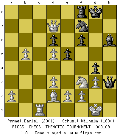 Last move : 1-0 2010 June 4 14:8:46 [Event "FICGS__CHESS__THEMATIC_TOURNAMENT__000109"] [Site "FICGS"] [Date "2010.03.27"] [Round "1"] [White "Parmet,Daniel"] [Black "Schuett,Wilhelm"] [Result "1-0"] [WhiteElo "2001"] [BlackElo "1800"] 1.c4 e5 2.Nc3 Nc6 3.g3 g6 4.Bg2 Bg7 5.d3 d6 6.Nf3 Nge7 7.O-O O-O 8.Rb1 Bd7 9.b4 Qc8 10.b5 Nd8 11.Bg5 f6 12.Bd2 Bh3 13.Nd5 Nxd5 14.Bxh3 Qxh3 15.cxd5 Nf7 16.Qc2 Rfc8 17.Rfc1 h5 18.Rb4 g5 19.Rc4 h4 20.Rxc7 Rxc7 21.Qxc7 hxg3 22.hxg3 Rf8 23.Qxb7 Bh6 24.Qxa7 g4 25.Qd7 1-0 English : Closed system Kingside Castling by player White (move 7) Kingside Castling by player Black (move 7) Player White won this chess game. Follow this game move after move (download)Tactics flow from a superior position. (Bobby Fischer) Kasparov stellt für gewöhnlich die Regeln auf und bricht sie dann selbst wieder. (Alexej Shirov) Cuando tengo las piezas blancas, yo gano porque soy blanco; Cuando tengo las piezas negras, yo gano porque soy Bogolyubov. (Bogolyubov) Botvinnik disait en comparant les échecs à la musique: Il existe une science dont le but est l'étude de l'acoustique et des sons. Mais il y a aussi un art qui se sert de l'océan des sons : c'est la musique. De toute évidence, il en est de même pour la pensée. La logique est l'étude des lois de la réflexion et les échecs reflètent, en tant qu'art, le côté logique de la réflexion, sous la forme d'images artistiques... Extrait de Fischer - Spassky, Reykjavik 1972 par Alexander & F. Wyndham (Ed. Solar), p 37. When you stop learning you start dying. (M. Scott Adams)