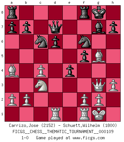 Last move : 1-0 2010 July 6 14:51:4 [Event "FICGS__CHESS__THEMATIC_TOURNAMENT__000109"] [Site "FICGS"] [Date "2010.03.27"] [Round "1"] [White "Carrizo,Jose"] [Black "Schuett,Wilhelm"] [Result "1-0"] [WhiteElo "2152"] [BlackElo "1800"] 1.c4 e5 2.Nc3 Nc6 3.Nf3 d6 4.d4 Bg4 5.d5 Nce7 6.e4 g6 7.h3 Bxf3 8.Qxf3 f5 9.Bd3 Qd7 10.O-O Bg7 11.Bc2 Nf6 12.exf5 gxf5 13.Ba4 c6 14.Bg5 O-O 15.dxc6 Nxc6 16.Rad1 e4 17.Qg3 1-0 English : Three knights system Kingside Castling by player White (move 10) Kingside Castling by player Black (move 14) Player White won this chess game. Follow this game move after move (download)Fischer is under obligation to nobody. (Joseph Platz) Ich suche im Schach immer etwas Eigenes. Riskantes Spiel im Stile schachlicher Musketiere ist nicht meine Sache, auch wenn es vielen Freunden scharfer Wendungen gefällt. (Anatoly Karpov) Antes de los Finales, los dioses han colocado el Juego Medio. (Siegbert Tarrasch) Fischer est le meilleur joueur du monde et Karpov n'est qu'un joueur de bistrot. (Garry Kasparov, agé de 16 ans) I find television to be very educating. Every time somebody turns on the set, I go in the other room and read a book. (Groucho Marx)