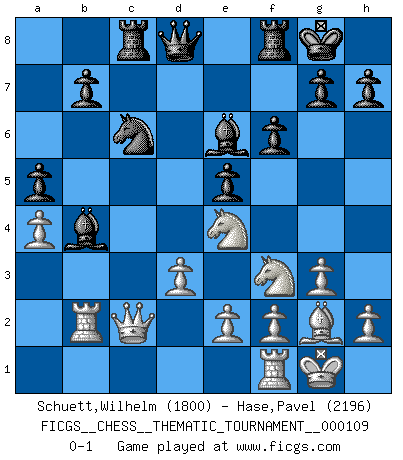 Last move : 0-1 2010 May 22 1:15:18 [Event "FICGS__CHESS__THEMATIC_TOURNAMENT__000109"] [Site "FICGS"] [Date "2010.03.27"] [Round "1"] [White "Schuett,Wilhelm"] [Black "Hase,Pavel"] [Result "0-1"] [WhiteElo "1800"] [BlackElo "2196"] 1.c4 e5 2.g3 Nf6 3.Bg2 d5 4.cxd5 Nxd5 5.Nc3 Nb6 6.Nf3 Nc6 7.a3 Be7 8.b4 Be6 9.Rb1 f6 10.Bb2 Nc4 11.O-O a5 12.b5 Nd4 13.a4 O-O 14.d3 Nxb2 15.Rxb2 Bb4 16.Ne4 c6 17.bxc6 Nxc6 18.Qc2 Rc8 0-1 English Opening Kingside Castling by player White (move 11) Kingside Castling by player Black (move 13) Player Black won this chess game. Follow this game move after move (download)When you see a good move, look for a better one. (Emanuel Lasker) Capablanka war das größte Genie der Schachgeschichte! Aber denken sie nicht er habe nichts vom Schach verstanden. Er wusste nur soviel wie er wissen musste um seine Ziele zu erreichen. (Mikhail Moiseyevich Botvinik) En el Ajedrez, cuando menos, el valiente hereda la tierra. (Edmar Mednis) Aidez vos pièces, elles vous aideront. (Paul Morphy) However beautiful the strategy, you should occasionally look at the results. (Winston Churchill)