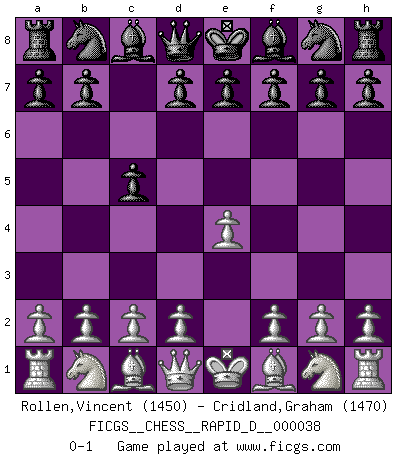 Last move : 0-1 2010 April 30 7:38:30 [Event "FICGS__CHESS__RAPID_D__000038"] [Site "FICGS"] [Date "2010.03.27"] [Round "1"] [White "Rollen,Vincent"] [Black "Cridland,Graham"] [Result "0-1"] [WhiteElo "1450"] [BlackElo "1470"] 1.e4 c5 0-1 This chess game has been lost on time (started : 2010.03.27 9:56:26) Sicilian defense Player Black won this chess game. Follow this game move after move (download)Every Chess master was once a beginner. (Chernev) Kostenjuk hat keinen Sexappeal. (Loek van Wely) Solo existe una cosa que Fischer hace en el Ajedrez sin placer: ¡perder!. (Boris Spassky) Les erreurs sont comme les malheurs, elles n'arrivent jamais seules. (Siegbert Tarrasch) Computers make it easier to do a lot of things, but most of the things they make it easier to do don't need to be done. (Andy Rooney)