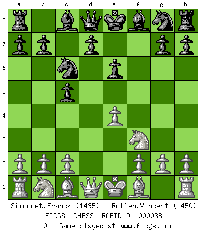 Last move : 1-0 2010 May 3 7:46:44 [Event "FICGS__CHESS__RAPID_D__000038"] [Site "FICGS"] [Date "2010.03.27"] [Round "1"] [White "Simonnet,Franck"] [Black "Rollen,Vincent"] [Result "1-0"] [WhiteElo "1495"] [BlackElo "1450"] 1.d4 c5 2.d5 e5 3.dxe6 fxe6 4.e4 Nc6 5.Nf3 1-0 This chess game has been lost on time (started : 2010.03.27 9:56:26) Old Benoni defense Player White won this chess game. Follow this game move after move (download)It's just you and your opponent at the board and you're trying to prove something. (Bobby Fischer) Ich spiele ehrlich und spiele, um zu gewinnen. Wenn ich verliere nehme ich meine Medizin. (Robert James Fischer) El juego de Fischer siempre fue nítido, racional y brillante. Uno de los mejores por siempre. (Dave Regis) Le moment que je préfère le plus dans une rencontre, c'est celui où je sens que la personnalité de l'adversaire se brise. (Robert Fischer) Indecision is the key to flexibility. (Unknown)