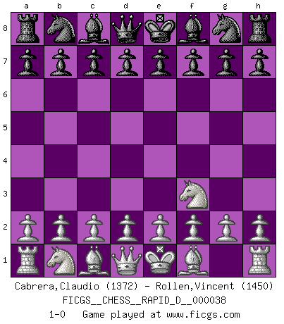 Last move : 1-0 2010 May 1 7:39:35 [Event "FICGS__CHESS__RAPID_D__000038"] [Site "FICGS"] [Date "2010.03.27"] [Round "1"] [White "Cabrera,Claudio"] [Black "Rollen,Vincent"] [Result "1-0"] [WhiteElo "1372"] [BlackElo "1450"] 1.Nf3 1-0 This chess game has been lost on time (started : 2010.03.27 9:56:26) Reti Opening Player White won this chess game. Follow this game move after move (download)Bobby Fischer's current state of mind is indeed a tragedy. One of the world's greatest Chess players - the pride and sorrow of American Chess. (Frank Brady) Oft bringt ein stiller Zug das Erdbeben. (Richard Reti) Entre mas años cumplo, mas valoro los Peones. (Keres) Il a essayé de se convaincre qu'il pourrait empêcher toutes les erreurs et ne jamais perdre. L'horreur ! Gary Kasparov au sujet de Robert Fischer. Without enthusiasm, virtue functions not at all, and vice only poorly. (Mignon McLaughlin, The Neurotic's Notebook, 1960)