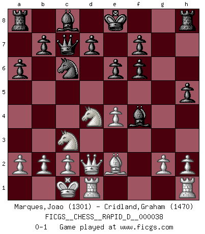 Last move : 0-1 2010 April 20 12:38:51 [Event "FICGS__CHESS__RAPID_D__000038"] [Site "FICGS"] [Date "2010.03.27"] [Round "1"] [White "Marques,Joao"] [Black "Cridland,Graham"] [Result "0-1"] [WhiteElo "1301"] [BlackElo "1470"] 1.e4 c5 2.Nf3 Nc6 3.d4 cxd4 4.Nxd4 Nf6 5.Nc3 e6 6.Bg5 Qc7 7.Bxf6 gxf6 8.Be2 a6 9.Qd2 h5 10.O-O-O Bh6 11.f4 Bxf4 0-1 Sicilian defense Queenside Castling by player White (move 10) Player Black won this chess game. Follow this game move after move (download)The older I grow, the more I value pawns. (Paul Keres) Ich spiele 70 Eröffnungssysteme. (Viktor Kortschnoi) ¿Esta Bobby Fischer algo cuerdo?. (Salo Flohr) Botvinnik disait en comparant les échecs à la musique: Il existe une science dont le but est l'étude de l'acoustique et des sons. Mais il y a aussi un art qui se sert de l'océan des sons : c'est la musique. De toute évidence, il en est de même pour la pensée. La logique est l'étude des lois de la réflexion et les échecs reflètent, en tant qu'art, le côté logique de la réflexion, sous la forme d'images artistiques... Extrait de Fischer - Spassky, Reykjavik 1972 par Alexander & F. Wyndham (Ed. Solar), p 37. The hypothalamus is one of the most important parts of the brain, involved in many kinds of motivation, among other functions. The hypothalamus controls the 'Four Fs: Fighting, Fleeing, Feeding and Mating. (Unknown author)