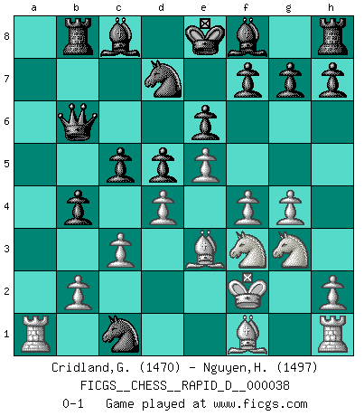 Last move : 0-1 2010 April 27 19:38:3 [Event "FICGS__CHESS__RAPID_D__000038"] [Site "FICGS"] [Date "2010.03.27"] [Round "1"] [White "Cridland,Graham"] [Black "Nguyen,Hao Nhien"] [Result "0-1"] [WhiteElo "1470"] [BlackElo "1497"] 1.e4 e6 2.d4 d5 3.Nc3 Nf6 4.e5 Nfd7 5.f4 c5 6.Nf3 Nc6 7.Ne2 a6 8.Be3 b5 9.c3 Qb6 10.Qd2 a5 11.a3 Rb8 12.g4 b4 13.axb4 axb4 14.Kf2 Na5 15.Ng3 Nb3 16.Qc1 Nxc1 0-1 French : Steinitz variation Player Black won this chess game. Follow this game move after move (download)Chess books should be used as we use glasses: to assist the sight, although some players make use of them as if they thought they conferred sight. (Jose Raul Capablanca) Im Schach nämlich geht es darum, daß Ich des Gegners klein zu kriegen, sein Ego zu zerbrechen und zu zermahlen, seine Selbstachtung zu zertreten und zu verscharren und seine ganze mißachtenswerte sogenannte Persönlichkeit ein für alle Mal tot zu hacken und zu zerstampfen und dadurch die menschliche Gesellschaft von einer stinkenden Pestbeule zu befreien. Es ist ein königliches Spiel. (Robert James Fischer) Hoy en día, si tu no eres un Gran Maestro a los 14 años, es mejor que lo olvides. (Anand Viswanathan) Je fais ceci parce que dans cinquante coups j'obtiendrai cela; je m'appelle Mikhail Moisevitch Botvinnik. (Botvinnik) Whatever you do, don't be bored. This is absolutely the most exciting time we could have possibly hoped to be alive. And things are just starting. (From movie Waking life)