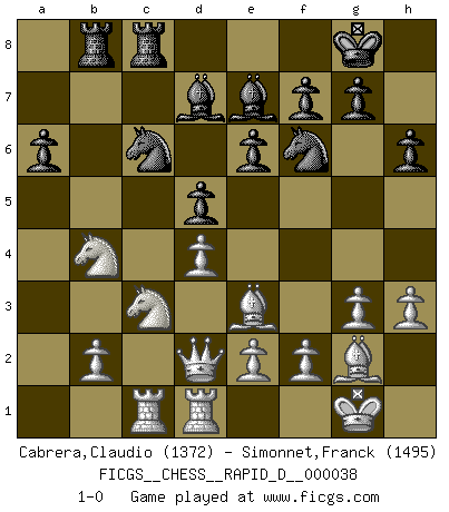 Last move : 1-0 2010 April 12 15:48:52 [Event "FICGS__CHESS__RAPID_D__000038"] [Site "FICGS"] [Date "2010.03.27"] [Round "1"] [White "Cabrera,Claudio"] [Black "Simonnet,Franck"] [Result "1-0"] [WhiteElo "1372"] [BlackElo "1495"] 1.Nf3 d5 2.d4 Nf6 3.c4 c6 4.Nc3 a6 5.cxd5 cxd5 6.g3 Nc6 7.Bg2 e6 8.Bg5 Be7 9.O-O O-O 10.Rc1 h6 11.Be3 Qa5 12.h3 Bd7 13.Nd2 b5 14.Nb3 Qc7 15.a3 Rac8 16.Qd2 Qb7 17.Rfd1 b4 18.axb4 Qxb4 19.Na1 Rb8 20.Nc2 Rfc8 21.Nxb4 1-0 Reti Opening Kingside Castling by player White (move 9) Kingside Castling by player Black (move 9) Player White won this chess game. Follow this game move after move (download)All I want to do, ever, is just play Chess. (Bobby Fischer) Fischer ist das größte Genie, das je vom Schachhimmel heruntergestiegen ist. (Mikhail Nekhemyevich Tal) Para mi, el Ajedrez es la vida y cada partida es como una nueva vida. Todo jugador de Ajedrez suele vivir muchas vidas durante su vida. (Eduard Gufeld) Je crois qu'il existe des manières très spécifiques de jouer efficacement contre une machine. Evidemment, nous n'avons aucune chance en technique pure, parce que l'ordinateur calcule de manière parfaite. Mais lorsque nous faisons appel à notre cerveau, en utilisant l'intuition et la compréhension, alors nous restons beaucoup plus forts. (Anatoli Karpov) Pushing plastic is for the many, pushing virtual pieces is for the fewer, pushing wood is for the very few. (Normajean Yates)