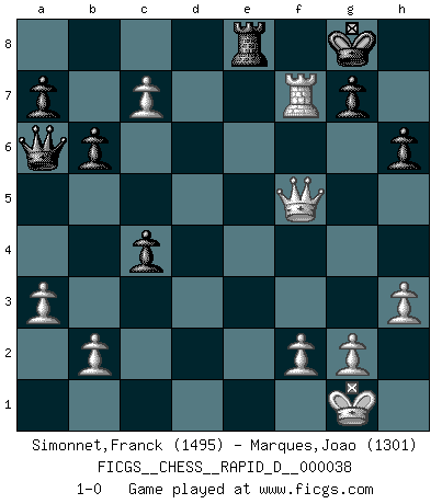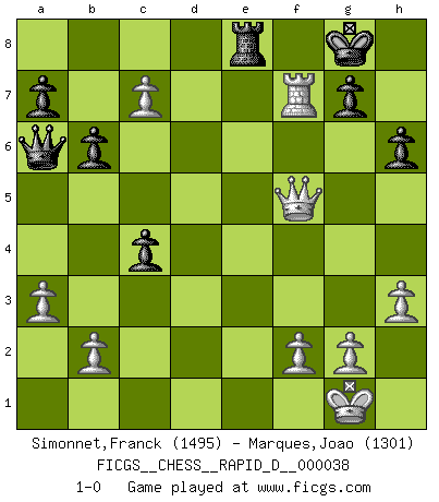 Last move : 1-0 2010 May 25 13:10:16 [Event "FICGS__CHESS__RAPID_D__000038"] [Site "FICGS"] [Date "2010.03.27"] [Round "1"] [White "Simonnet,Franck"] [Black "Marques,Joao"] [Result "1-0"] [WhiteElo "1495"] [BlackElo "1301"] 1.d4 Nf6 2.c4 e6 3.Nc3 d5 4.cxd5 exd5 5.Bg5 Be7 6.e3 O-O 7.Bd3 Nc6 8.Nf3 Bg4 9.O-O h6 10.Bh4 Nb4 11.Be2 c5 12.dxc5 Rc8 13.a3 Nc6 14.Bxf6 Bxf6 15.Nd4 Bxe2 16.Ncxe2 Re8 17.Rc1 Nxd4 18.Nxd4 Qa5 19.Qc2 b6 20.c6 Bxd4 21.exd4 Re4 22.c7 Rxd4 23.Qf5 Qa6 24.Rfe1 Rc4 25.Rxc4 dxc4 26.Re7 Rf8 27.Rxf7 Re8 28.h3 1-0 Queen's pawn game Kingside Castling by player Black (move 6) Kingside Castling by player White (move 9) Player White won this chess game. Follow this game move after move (download)Of all my Russian books, the defense contains and diffuses the greatest 'warmth' which may seem odd seeing how supremely abstract Chess is supposed to be. (Vladimir Nabokov) Die Auseinandersetzung mit Karpow war politisch geprägt. Er stand für das kommunistische System, wurde von dessen Repräsentanten gehätschelt. Ich war der Oppositionelle. Jeder Schachweltmeister spiegelt auch die gesellschaftlichen Verhältnisse wider. Kramnik steht für die Börsen-Generation des Neuen Markts, ideologiefrei, zahlenfixiert. (Garry Kasparov) La vida es como un juego de Ajedrez, cambiando con cada movimiento. (Proverbio Chino) Soyez une menace à chaque fois que vous vous asseyez pour jouer. (Ken Smith) Chess is as much a mystery as women. (Purdy)