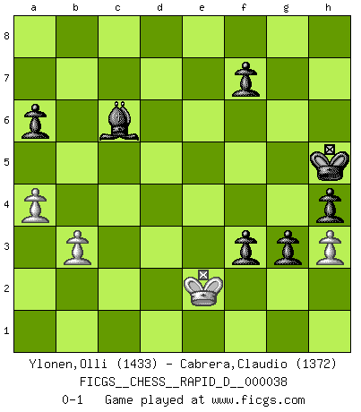 Last move : 0-1 2010 June 9 22:40:6 [Event "FICGS__CHESS__RAPID_D__000038"] [Site "FICGS"] [Date "2010.03.27"] [Round "1"] [White "Ylonen,Olli"] [Black "Cabrera,Claudio"] [Result "0-1"] [WhiteElo "1433"] [BlackElo "1372"] 1.e4 c5 2.d4 cxd4 3.Nf3 Nc6 4.Nxd4 Nf6 5.Nxc6 bxc6 6.Nc3 d5 7.exd5 cxd5 8.Bb5+ Bd7 9.Nxd5 Bxb5 10.Nxf6+ exf6 11.Qxd8+ Rxd8 12.Bd2 Bc5 13.f3 O-O 14.O-O-O Rfe8 15.Ba5 Be3+ 16.Bd2 Rxd2 17.Rxd2 Bxd2+ 18.Kxd2 Re2+ 19.Kc3 Rxg2 20.Kb4 a6 21.Kb3 Rf2 22.c4 Rxf3+ 23.Kb4 Be8 24.b3 g5 25.Rc1 g4 26.Rc3 h5 27.c5 h4 28.c6 Rxc3 29.Kxc3 Bxc6 30.Kd4 Kg7 31.Ke3 Kg6 32.Kf4 Kh5 33.a4 f5 34.h3 g3 35.Ke3 f4+ 36.Ke2 f3+ 0-1 Sicilian : Smith-Morra gambit Kingside Castling by player Black (move 13) Queenside Castling by player White (move 14) Player Black won this chess game. Follow this game move after move (download)The isolated Pawn casts gloom over the entire chessboard. (Aaron Nimzovich) Ich weiss nicht was Gott gegen mich auf 1.e4 antworten würde. (Robert James Fischer) El Ajedrez es realmente noventa y nueve por ciento calculación. (Soltis) Des combinaisons [dans le jeu d'échecs] pareilles à des mélodies. Je crois entendre pour ainsi dire la musique des coups... (Vladimir Nabokov) The large trees attract high winds. (Chinese proverb)