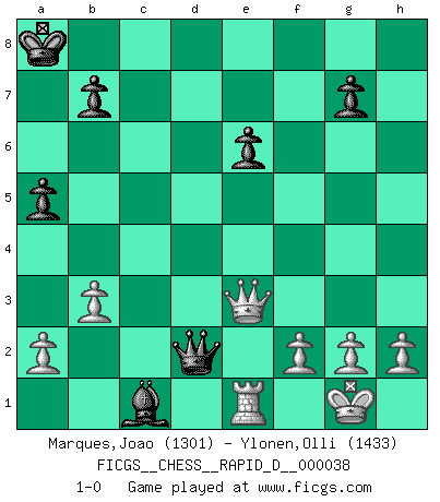 Last move : 1-0 2010 June 28 21:43:44 [Event "FICGS__CHESS__RAPID_D__000038"] [Site "FICGS"] [Date "2010.03.27"] [Round "1"] [White "Marques,Joao"] [Black "Ylonen,Olli"] [Result "1-0"] [WhiteElo "1301"] [BlackElo "1433"] 1.e4 c6 2.d4 d5 3.exd5 cxd5 4.Nf3 Nf6 5.Bb5+ Bd7 6.Bxd7+ Qxd7 7.O-O e6 8.Nc3 Nc6 9.Bg5 Be7 10.Qd2 h6 11.Rad1 hxg5 12.Nxg5 O-O-O 13.Nxf7 Ne4 14.Nxe4 dxe4 15.Nxd8 Qxd8 16.Rfe1 Bg5 17.Qc3 Qf6 18.Rxe4 Rh4 19.Rde1 Rxe4 20.Rxe4 Kb8 21.Qg3+ Ka8 22.c3 Bc1 23.b3 a5 24.Re2 Nxd4 25.cxd4 Qxd4 26.Re1 Qd2 27.Qe3 1-0 Caro-Kann : Exchange variation Kingside Castling by player White (move 7) Queenside Castling by player Black (move 12) Player White won this chess game. Follow this game move after move (download)Chess makes man wiser and clear-sighted. (Vladimir Putin) Wenn ich mich einlogge, glauben die Leute gewöhnlich nicht, dass ich es selbst bin und sie fangen an, mir dumme Fragen zu stellen. Und wenn sie es glauben, stellen sie wieder andere dumme Fragen. (Judith Polgar) El Ajedrez es una guerra en un tablero. El objetivo es aplastar la mente del oponente. (Bobby Fischer) La victoire dans une partie d'Echecs appartient la plupart du temps à celui qui voit un peu plus loin que l'adversaire. (Lasker) Train yourself to let go of everything you fear to lose. (Master Yoda in Star Wars ep.3)