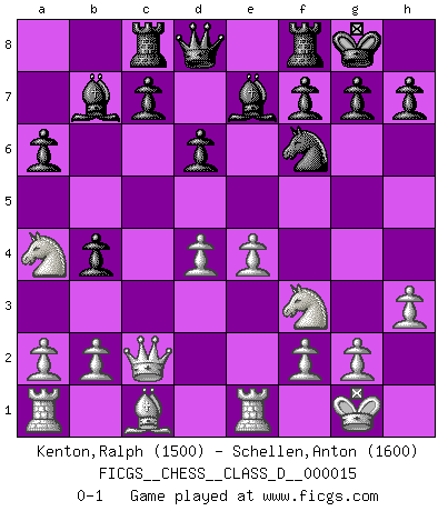 Last move : 0-1 2007 January 18 18:37:46 [Event "FICGS__CHESS__CLASS_D__000015"] [Site "FICGS"] [Date "2006.10.23"] [Round "1"] [White "Kenton,Ralph"] [Black "Schellen,Anton"] [Result "0-1"] [WhiteElo "1500"] [BlackElo "1600"] 1.e4 e5 2.Nf3 Nc6 3.Bb5 a6 4.Ba4 Nf6 5.O-O Be7 6.Re1 d6 7.c3 O-O 8.h3 b5 9.Bc2 Bb7 10.d4 exd4 11.cxd4 Nb4 12.Nc3 Nxc2 13.Qxc2 b4 14.Na4 Rc8 0-1 This chess game has been lost on time (started : 2006.10.23 17:48:57) Ruy Lopez : Closed, Averbach variation Kingside Castling by player White (move 5) Kingside Castling by player Black (move 7) Player Black won this chess game. Follow this game move after move (download)There are tough players and nice guys, and I'm a tough player. (Bobby Fischer) Jeder leidlich begabte Spieler, er braucht keineswegs hervorragend veranlagt zu sein, kann es zum Meister bringen. Aber das ist ja auch gar nicht nötig! Der richtige Standpunkt ist es, zu seinem Vergnügen zu spielen, und man glaube ja nicht, dass der Genuss proportional dem Können sei. (Siegbert Tarrasch) Antes de los Finales, los dioses han colocado el Juego Medio. (Siegbert Tarrasch) Les échecs, c'est l'imagination. (David Bronstein) Political correctness is subjecting us to gross incompetence. (Johann Piek)