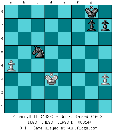 Last move : 0-1 2010 July 16 20:47:56 [Event "FICGS__CHESS__CLASS_D__000144"] [Site "FICGS"] [Date "2010.03.27"] [Round "1"] [White "Ylonen,Olli"] [Black "Gonet,Gerard"] [Result "0-1"] [WhiteElo "1433"] [BlackElo "1600"] 1.e4 Nc6 2.d4 d5 3.Nc3 e6 4.Nf3 Nf6 5.e5 Ne4 6.Bd2 Nxd2 7.Qxd2 Bb4 8.a3 Ba5 9.g3 O-O 10.Bg2 a6 11.O-O Bd7 12.b4 Bb6 13.Ne2 f6 14.exf6 Qxf6 15.c3 Rae8 16.Qg5 Rf7 17.Qxf6 Rxf6 18.Nf4 Ne7 19.Ne5 Bb5 20.Rfe1 Ref8 21.f3 Ba7 22.Ng4 Rxf4 23.gxf4 Rxf4 24.Rxe6 Ng6 25.Rae1 a5 26.bxa5 Bd7 27.R6e3 c5 28.Kf1 cxd4 29.cxd4 Bxd4 30.Rd3 Bxg4 31.h3 Bh5 32.Rb1 Ne5 33.Rdb3 Bxf3 34.Bxf3 Nxf3 35.Ke2 Ne5 36.Rxb7 Rf3 37.R1b3 Rf2+ 38.Kd1 Nc6 39.a6 Rf8 40.Kd2 Na5 41.R3b4 Nxb7 42.Rxd4 Nc5 43.Rxd5 Nxa6 44.a4 Rf3 45.Rd3 Rxd3+ 46.Kxd3 Nc5+ 0-1 KP : Nimzovich defense, Bogolyubov variation Kingside Castling by player Black (move 9) Kingside Castling by player White (move 11) 10 pieces endgame at move 43 : White KRPPP , Black KRNPP WHITE : King + 1 Rook 3 Pawns BLACK : King + 1 Rook 1 Knight 2 Pawns 9 pieces endgame at move 43 : White KRPP , Black KRNPP WHITE : King + 1 Rook 2 Pawns BLACK : King + 1 Rook 1 Knight 2 Pawns 8 pieces endgame at move 45 : White KPP , Black KRNPP WHITE : King + 2 Pawns BLACK : King + 1 Rook 1 Knight 2 Pawns 7 pieces endgame at move 46 : White KPP , Black KNPP WHITE : King + 2 Pawns BLACK : King + 1 Knight 2 Pawns Player Black won this chess game. Follow this game move after move (download)It began to feel as though you were playing against Chess itself. - On playing against Robert Fischer. (Walter Shipman) Das Zentrum ist der Balkan des Schachbretts - Kriegshandlungen können in jedem Moment ausbrechen. (Aaron Nimzowitsch) Debes de llevar a tu oponente hacia un profundo y obscuro bosque donde 2+2=5, y el camino que conduce a la salida es suficientemente ancho para solamente uno. (Mikhail Tal) Le moment que je préfère le plus dans une rencontre, c'est celui où je sens que la personnalité de l'adversaire se brise. (Robert Fischer) Now you put water in a cup, it becomes the cup; You put water into a bottle it becomes the bottle; You put it in a teapot it becomes the teapot. Water can flow or it can crash. Be water, my friend. (Bruce Lee)