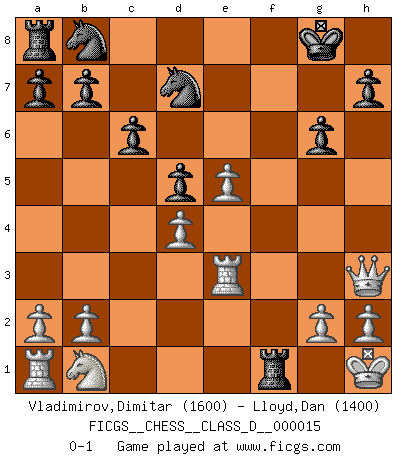 Last move : 0-1 2006 November 30 10:45:30 [Event "FICGS__CHESS__CLASS_D__000015"] [Site "FICGS"] [Date "2006.10.23"] [Round "1"] [White "Vladimirov,Dimitar"] [Black "Lloyd,Dan"] [Result "0-1"] [WhiteElo "1600"] [BlackElo "1400"] 1.e4 e5 2.Nf3 d6 3.Bc4 Bg4 4.c3 Bxf3 5.Qxf3 Nf6 6.O-O Be7 7.d4 exd4 8.cxd4 O-O 9.Bg5 Nfd7 10.Be3 c6 11.Bd3 Bf6 12.Re1 Bg5 13.Qh3 Bxe3 14.Rxe3 g6 15.f4 Qf6 16.f5 d5 17.fxg6 fxg6 18.e5 Qf2+ 19.Kh1 Qf1+ 20.Bxf1 Rxf1+ 0-1 Philidor's defense Kingside Castling by player White (move 6) Kingside Castling by player Black (move 8) Player Black won this chess game. Follow this game move after move (download)When asked, -How is that you pick better moves than your opponents?, I responded: I'm very glad you asked me that, because, as it happens, there is a very simple answer. I think up my own moves, and I make my opponent think up his. (Alexander Alekhine) Ich trinke, ich rauche, ich spiele, ich liebe Frauen aber Fernschach ist ein Laster, das ich nicht habe. (Mikhail Nekhemyevich Tal) El Ajedrez es una manera fabulosa para que los niños aprendan a autovalorarse y a autoestimarse. (Saudin Robovic) Il vaut mieux sacrifier les pièces de l'adversaire. (Xavier Tartacover) CHESS, n. f. [echecs, Fr.] A nice and abstruse game, in which two sets of puppets are moved in opposition to each other. (Dr Samuel Johnson, A Dictionary Of The English Language, 1755)
