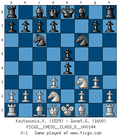 Last move : 0-1 2010 May 9 7:50:7 [Event "FICGS__CHESS__CLASS_D__000144"] [Site "FICGS"] [Date "2010.03.27"] [Round "1"] [White "Koutsounis,Vassilios"] [Black "Gonet,Gerard"] [Result "0-1"] [WhiteElo "1529"] [BlackElo "1600"] 1.e4 Nc6 2.Nf3 f5 3.d3 e5 4.Nbd2 Nf6 5.g3 fxe4 0-1 This chess game has been lost on time (started : 2010.03.27 10:28:6) KP : Colorado counter Player Black won this chess game. Follow this game move after move (download)The hallmark of the artist is simplicity. (Larry Evans) Sie bekommen vielleicht den Eindruck, dass die Spitzenspieler überhaupt gar nicht so stark sind. Aber das stimmt nicht. Es ist eine Illusion. Mit einem Computer an der Seite ist es sehr leicht, Urteile zu fällen, aber wenn man alleine am Brett sitzt, sieht die Sache ganz anders aus. (Vladimir Kramnik) Bobby Fischer es el jugador de Ajedrez mas grande que jamás haya existido. (Ken Smith) Les échecs sont plus proches de l'art de l'assassinat que de l'art de la guerre. (Arturo Perez-Reverte) Plans are ideas that never come to fruition. (Daniel Parmet)