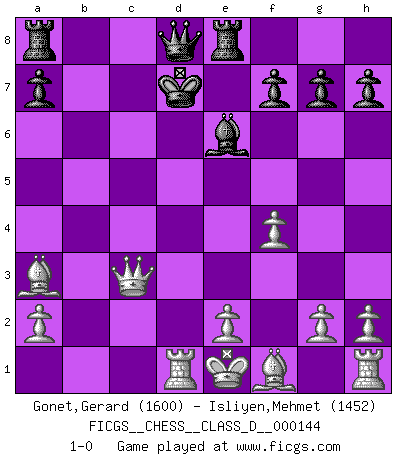 Last move : 1-0 2010 April 4 13:7:23 [Event "FICGS__CHESS__CLASS_D__000144"] [Site "FICGS"] [Date "2010.03.27"] [Round "1"] [White "Gonet,Gerard"] [Black "Isliyen,Mehmet"] [Result "1-0"] [WhiteElo "1600"] [BlackElo "1452"] 1.f4 d5 2.c4 Nf6 3.d4 e6 4.Nc3 c5 5.Nf3 cxd4 6.Nxd4 Bb4 7.Qa4+ Nc6 8.Nxc6 Bxc3+ 9.bxc3 bxc6 10.Qxc6+ Bd7 11.Qa6 Ne4 12.cxd5 Nxc3 13.dxe6 Bxe6 14.Qc6+ Ke7 15.Qxc3 Re8 16.Ba3+ Kd7 17.Rd1+ 1-0 Mujannah Opening Player White won this chess game. Follow this game move after move (download)All my games are real. (Bobby Fischer) Ein Springer auf f6 gegen die eigene Rochadestellung ist schlimmer als ein rostiger Nagel im Knie. (Efim Bogoljubov) Un Peón pasado es un criminal, quién debe ser mantenido bajo candado y llave. Leves medidas, tales como vigilancia policiaca, no son suficientes. (Aaron Nimzovich) A chaque perte on perd un peu de soi. (Joël Lautier) But they are useless. They can only give you answers. (Pablo Picasso, about computers)