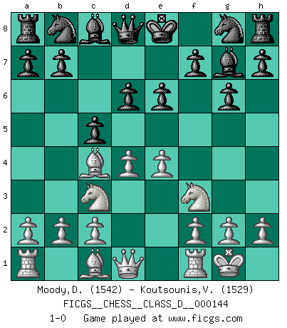 Last move : 1-0 2010 May 10 7:49:29 [Event "FICGS__CHESS__CLASS_D__000144"] [Site "FICGS"] [Date "2010.03.27"] [Round "1"] [White "Moody,David"] [Black "Koutsounis,Vassilios"] [Result "1-0"] [WhiteElo "1542"] [BlackElo "1529"] 1.e4 c5 2.Bc4 e6 3.Nc3 g6 4.d4 d6 5.Nf3 Bg7 6.O-O 1-0 This chess game has been lost on time (started : 2010.03.27 10:28:6) Sicilian defense Kingside Castling by player White (move 6) Player White won this chess game. Follow this game move after move (download)Though most people love to look at the games of the great attacking masters, some of the most successful players in history have been the quiet positional players. They slowly grind you down by taking away your space, tying up your pieces, and leaving you with virtually nothing to do ! (Yasser Seirawan) Kein Schachspieler kann gut schlafen. (H. G. Wells) La esencia del Ajedrez es pensar acerca de lo que el Ajedrez es. (David Bronstein) Le succès, c'est être capable d'aller d'échec en échec sans perdre son enthousiasme. (Winston Churchill) A married woman is like a fish riding a bicycle. (Rodolfo d'Ettorre)