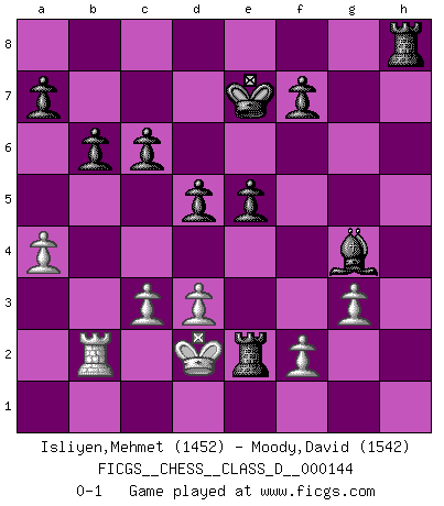 Last move : 0-1 2010 May 2 17:59:36 [Event "FICGS__CHESS__CLASS_D__000144"] [Site "FICGS"] [Date "2010.03.27"] [Round "1"] [White "Isliyen,Mehmet"] [Black "Moody,David"] [Result "0-1"] [WhiteElo "1452"] [BlackElo "1542"] 1.e4 d5 2.d4 e6 3.Nc3 Nf6 4.Bg5 Bb4 5.e5 h6 6.exf6 hxg5 7.fxg7 Rg8 8.h4 gxh4 9.Rxh4 Qxh4 10.Nf3 Bxc3+ 11.bxc3 Qf6 12.Ne5 Nd7 13.Bb5 c6 14.Ba4 Nxe5 15.dxe5 Qxe5+ 16.Kd2 Qf4+ 17.Ke1 Qxa4 18.Qd3 Qe4+ 19.Kd2 Qxd3+ 20.cxd3 Rxg7 21.g3 Ke7 22.Re1 Rh7 23.Rg1 e5 24.Ke2 Bg4+ 25.Ke3 Rah8 26.Rb1 b6 27.a4 Rh1 28.Rb2 Re1+ 29.Kd2 Re2+ 0-1 Scandinavian (centre counter) defense Player Black won this chess game. Follow this game move after move (download)We like to think. (Gary Kasparov) Das Schach hält seine Meister in eigenen Banden, Fesseln; auf vielerlei Weise formt es ihren Geist, so dass die innere Freiheit selbst des Stärksten beeinflusst wird. (Albert Einstein) Si pudieramos observar el interior de la cabeza de un jugador de Ajedrez, encontraríamos ahí un mundo lleno de sentimientos, imágenes, ideas, emoción y pasión. (Alfred Binet) C'est une question de caractère, Beaucoup de gens perdent leur motivation très vite. D'autres, ils sont rares, peuvent la conserver très longtemps. J'aime les échecs, encore aujourd'hui je suis heureux d'analyser des parties. J'aime toujours gagner, je déteste encore perdre. Bien jouer est important pour mon intégrité intellectuelle et morale. Et puis les échecs vivent en ce moment une période historique grâce à Internet. Ils se développent dans les systèmes éducatifs à travers le monde. Ils sortent de leur ghetto, et c'est mon rôle de mener à bien cette révolution. (Gary Kasparov) Lamb in skin of tiger, still fears the wolf. (Chinese proverb)