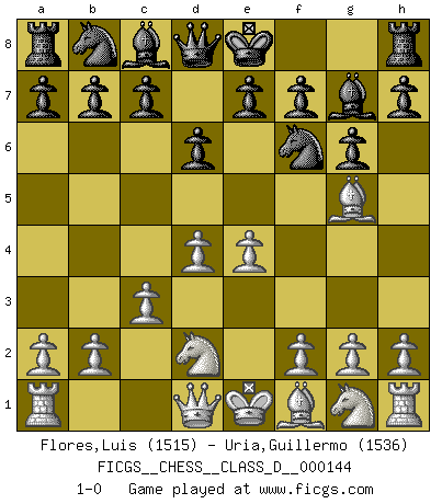 Last move : 1-0 2010 May 10 19:51:3 [Event "FICGS__CHESS__CLASS_D__000144"] [Site "FICGS"] [Date "2010.03.27"] [Round "1"] [White "Flores,Luis"] [Black "Uria,Guillermo"] [Result "1-0"] [WhiteElo "1515"] [BlackElo "1536"] 1.d4 Nf6 2.Bg5 d6 3.Nd2 g6 4.c3 Bg7 5.e4 1-0 This chess game has been lost on time (started : 2010.03.27 10:28:6) Trompowsky attack (Ruth, Opovcensky Opening) Player White won this chess game. Follow this game move after move (download)You are for me the Queen on d8 and I am the Pawn on d7 !! (Eduard Gufeld) Ich hatte Zahnschmerzen im ersten Spiel. In der zweiten Partie tat mir der Kopf weh. In der dritten war es eine Rheuma-Attacke und während der vierten fühlte ich mich nicht gut. Und in der fünften? Nun, man muss doch nicht jedes Spiel gewinnen, oder? (Savielly Grigorievitsch Tartakower) Las combinaciones han sido siempre el aspecto más intrigante del Ajedrez. Los Maestros las buscan, el público las aplauden, los críticos las alaban. La razón se debe a que las combinaciones hacen posible que el Ajedrez sea más que un ejercicio matemático con una carencia de vida. Ellas son la poesía del juego, son del Ajedrez lo que la melodía es de la música. Ellas representan el triunfo de la mente sobre la materia. (Reuben Fine) Shah mat. Le roi est mort. Cri de fierté d'un joueur venant de terrasser son adversaire, courtoisement, sans effusion de sang. Good luck. You're gonna need it. (Han Solo in Star Wars ep.6)