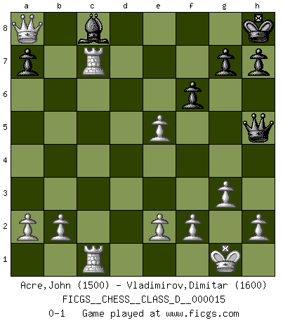 Last move : 0-1 2007 January 29 13:48:45 [Event "FICGS__CHESS__CLASS_D__000015"] [Site "FICGS"] [Date "2006.10.23"] [Round "1"] [White "Acre,John"] [Black "Vladimirov,Dimitar"] [Result "0-1"] [WhiteElo "1500"] [BlackElo "1600"] 1.d4 d5 2.Nf3 Nf6 3.c4 c6 4.Qc2 e6 5.g3 Bb4+ 6.Nbd2 O-O 7.Bg2 Ne4 8.O-O Nxd2 9.Bxd2 Bxd2 10.Qxd2 Na6 11.Rac1 Qb6 12.Rc3 Qa5 13.Rfc1 dxc4 14.Ne5 Nc7 15.Nxc4 Qh5 16.Ne5 f6 17.Bf3 Qe8 18.Nxc6 bxc6 19.Bxc6 Qh5 20.Bxa8 e5 21.Rxc7 Ba6 22.dxe5 Rxa8 23.Qd5+ Kh8 24.Qxa8+ Bc8 0-1 Queen's pawn game Kingside Castling by player Black (move 6) Kingside Castling by player White (move 8) Player Black won this chess game. Follow this game move after move (download)You sit at the board and suddenly your heart leaps. Your hand trembles to pick up the piece and move it. But what Chess teaches you is that you must sit there calmly and think about whether it's really a good idea and whether there are other better ideas. (Stanley Kubrick) Schach ist Krieg, im Schach geht es um testosterongesteuerte Urschreie. (Garry Kasparov) Hay dos clases de hombres: aquellos que se conforman en dejarse llevar por las circunstancias y que juegan barajas y aquellos decididos a controlar las circunstancias y que juegan al Ajedrez. (Mortimer Collins) Je ne suis pas le dernier à jouer lâchement des coups douteux pendant le zeïtnot de l'adversaire pour l'achever: en effet les coups qui font le plus peur sont ceux que l'on ne comprend pas. Je me fais souvent peur quand je joue. (Un professeur anonyme) I don't believe in psychology. I believe in good moves. (Bobby Fischer)
