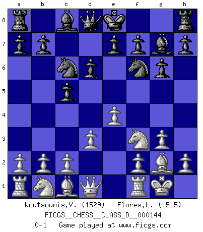 Last move : 0-1 2010 May 11 19:51:15 [Event "FICGS__CHESS__CLASS_D__000144"] [Site "FICGS"] [Date "2010.03.27"] [Round "1"] [White "Koutsounis,Vassilios"] [Black "Flores,Luis"] [Result "0-1"] [WhiteElo "1529"] [BlackElo "1515"] 1.e4 c5 2.Nf3 Nc6 3.g3 Nf6 4.Bg2 d6 5.O-O g6 6.d3 Bg7 0-1 This chess game has been lost on time (started : 2010.03.27 10:28:6) Sicilian defense Kingside Castling by player White (move 5) Player Black won this chess game. Follow this game move after move (download)War is the child of passion, passion is the child of narcissism and narcissism is the child. (...) Another game ? (Thibault de Vassal) Wenn Spassky eine Figur opfert kannst du genauso gut aufgeben. Aber wenn Tal eine Figur opfert, spiel weiter. Er könnte noch eine weitere opfern, und dann ... wer weiß? (Miguel Najdorf) Yo tuve un dolor de muelas en la primer partida. En el segundo juego, tuve un dolor de cabeza. En el tercero, tuve un ataque de reumatísmo. En la cuarta partida, no me sentía muy bien. ¿Y en el quinto juego? Bueno, ¿que acaso uno tiene que ganar todos los juegos?. (Siegbert Tarrasch) La vie est comme un jeu d'échecs : nous esquissons un plan, mais celui-ci est tributaire de ce que daignent faire l'adversaire aux échecs et le destin dans la vie. (Arthur Schopenhauer) Never risk one's whole fortune unless supported by one's entire army. (Niccolo Machiavelli)