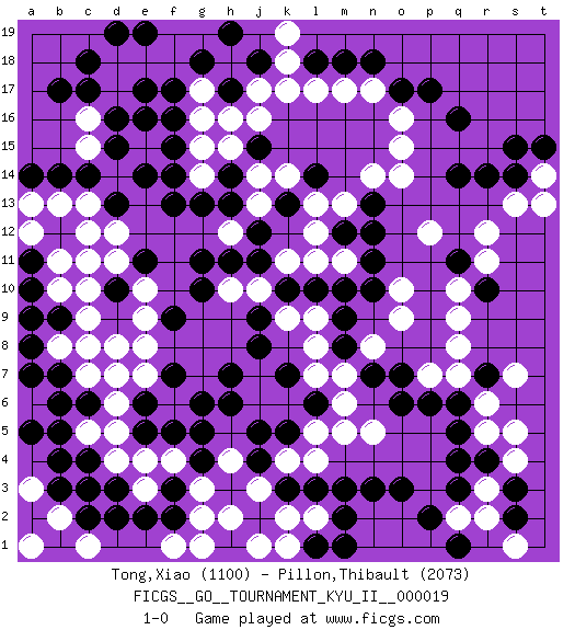 Last move : 1-0 2010 June 22 21:5:38 [Event "FICGS__GO__TOURNAMENT_KYU_II__000019"] [Site "FICGS"] [Date "2010.03.28"] [Round "1"] [Black "Tong,Xiao"] [White "Pillon,Thibault"] [Result "1-0"] [Rating 1 "1100"] [Rating 2 "2073"] 1.q16 d4 2.q4 d17 3.d15 c15 4.d16 c16 5.e17 d14 6.c17 d18 7.b17 e18 8.f17 f18 9.c14 e15 10.e16 g17 11.f16 g16 12.f15 g15 13.f14 g14 14.f13 o16 15.q14 o14 16.o17 n17 17.p17 o15 18.n18 m17 19.m18 l17 20.c6 f4 21.b4 c8 22.e6 c13 23.b14 b13 24.d13 d12 25.e14 c11 26.c3 c5 27.b5 j3 28.d10 c10 29.b7 r6 30.b9 b8 31.a8 b10 32.b12 a12 33.a11 a13 34.a10 c9 35.a9 b11 36.a7 e8 37.g6 e10 38.o3 q10 39.f2 d6 40.g4 c7 41.b6 g3 42.f3 h4 43.g5 e3 44.e2 d5 45.j5 l4 46.l6 n5 47.q6 q7 48.p6 r5 49.n3 m5 50.l3 k4 51.n7 k6 52.e5 e4 53.f9 e9 54.k5 l5 55.k7 j6 56.h6 j7 57.j8 m7 58.h7 m6 59.m8 n8 60.o7 l8 61.m9 l7 62.k10 g2 63.d3 l2 64.m3 k2 65.m2 f1 66.d2 l9 67.l10 k9 68.j9 j10 69.m10 o9 70.j11 h10 71.f5 e7 72.f7 k11 73.j12 l12 74.m12 l13 75.g11 h2 76.j4 j1 77.k3 r3 78.r4 s4 79.q3 r2 80.r7 q8 81.s3 s5 82.s2 r12 83.q5 s7 84.r14 s13 85.l18 k18 86.s14 t14 87.t15 t13 88.s15 j13 89.g10 m13 90.h13 j14 91.q11 r11 92.r10 q9 93.n12 p12 94.c18 m11 95.n11 l11 96.n10 o10 97.h14 h15 98.j18 k19 99.h17 j17 100.g18 g19 101.h19 h18 102.a14 c12 103.g18 h12 104.h11 h18 105.d7 d8 106.g18 p7 107.o6 h18 108.c4 d7 109.g18 q2 110.p2 h18 111.l1 g1 112.g18 f19 113.d19 h18 114.m1 k1 115.g18 s1 116.q1 h18 117.e11 d11 118.g18 b2 119.e19 c1 120.c2 a3 121.b3 a1 122.a5 h16 123.g13 h18 124.n13 n14 125.h17 k17 126.j15 j16 127.k13 k14 128.l14 1-0 Here are the names of the openings (joseki) played in the four corners : Corner d16 : d17 d15 Komoku (Somok, Xiao~mu`) 3-4 Point. The komoku (3-4) point is the traditional corner enclosure move.. Ikken Takagakari (Hankan Nop'dakeolch'im, Yi Gaogua`jiao~, 1-Space High Approach). The 5-4 approach move has become more popular in modern times, as modern Go emphasizes speed and influence. Corner q16 : q16 o16 Hoshi (Hwajeom, Seongjeom, Xingwei`) 4-4 Point. The star or hoshi (4-4) point, emphasizing influence at the potential expense of territory. Ikken Takagakari (Hankan Nop'dakeolch'im, Yi Gaojia, 1-Space High Approach). Black typically responds at 6-4 or 3-10. Black 4-10 is played when Black finds play on the right side advantageous. Black 4-8 or 3-8 may be played when Black has support at top. Corner d4 : d4 c6 Hoshi (Hwajeom, Seongjeom, Xingwei`) 4-4 Point. The star or hoshi (4-4) point, emphasizing influence at the potential expense of territory. Ikken Kakari (Hankan Keolch'im, Yi Gua`jiao~, 1-Space Low Approach). Black 2 is the standard approach move to the 4-4. Corner q4 : q4 r6 Hoshi (Hwajeom, Seongjeom, Xingwei`) 4-4 Point. The star or hoshi (4-4) point, emphasizing influence at the potential expense of territory. Ikken Kakari (Hankan Keolch'im, Yi Gua`jiao~, 1-Space Low Approach). White 2 is the standard approach move to the 4-4. Player Black won this Go (weiqi, baduk) game. Follow this game move after move (download)The poor player plays the opponent's game for him. (Anonymous) He who is a good ruler must first have been ruled. (Aristotle)
