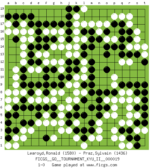 Last move : 1-0 2010 August 5 14:12:8 [Event "FICGS__GO__TOURNAMENT_KYU_II__000019"] [Site "FICGS"] [Date "2010.03.28"] [Round "1"] [Black "Learoyd,Ronald"] [White "Praz,Sylvain"] [Result "1-0"] [Rating 1 "1580"] [Rating 2 "1436"] 1.q16 d16 2.q3 d3 3.r9 k4 4.c6 c8 5.m4 o17 6.q14 q18 7.g17 l17 8.d18 c17 9.c18 c13 10.j17 r17 11.c4 c3 12.d4 e4 13.e5 f4 14.m9 f5 15.e6 r12 16.r13 q12 17.o13 r5 18.s4 r4 19.r3 q8 20.q9 p9 21.p8 r8 22.s8 s7 23.s9 p10 24.s6 r6 25.t7 s5 26.r7 q7 27.q6 p7 28.o8 s7 29.t6 p5 30.t5 t8 31.r7 o7 32.n8 s3 33.t4 s7 34.t9 t3 35.r7 p3 36.q5 s7 37.t8 q4 38.s2 q2 39.r2 l6 40.m6 n3 41.m3 m2 42.l2 n2 43.k3 n4 44.n5 o5 45.n7 s15 46.s13 e8 47.e12 d11 48.f15 o15 49.p14 l15 50.o11 g7 51.b3 b2 52.a4 h3 53.b5 g12 54.e14 e11 55.d12 c12 56.d14 c14 57.a2 k9 58.f2 g2 59.l7 k7 60.k6 j6 61.l5 j7 62.j4 h4 63.j5 h5 64.k11 l10 65.m11 l11 66.m12 l12 67.l13 k13 68.l14 k14 69.m15 k16 70.m16 m17 71.l16 k15 72.m14 p15 73.q15 g14 74.b15 b16 75.b18 c15 76.e17 k17 77.c10 h16 78.b8 b9 79.c9 b7 80.d8 a8 81.d9 d7 82.c7 e7 83.f6 b10 84.f10 b8 85.f11 f12 86.c11 b11 87.e9 g8 88.d6 f9 89.j18 k18 90.h10 h11 91.g9 g10 92.f8 f7 93.g11 h12 94.j10 j3 95.k5 k2 96.l3 l1 97.g15 h15 98.h17 c2 99.b17 a16 100.o14 p2 101.q17 r18 102.p17 p18 103.o16 n16 104.n15 n17 105.m10 s14 106.r16 s16 107.k12 k10 108.j11 t13 109.t12 t14 110.k19 l19 111.j19 f16 112.e16 g16 113.f14 h14 114.f17 a6 115.b6 l8 116.m8 d15 117.e15 j9 118.h9 h8 119.f9 a7 120.a5 r14 121.q13 b1 122.g6 h6 123.g5 g4 124.d17 c16 125.j12 r7 126.o6 p6 127.n6 j13 128.j16 r1 129.s1 q1 130.d13 f13 131.j15 a17 132.a18 j14 133.l9 k8 134.a3 e13 135.r15 a1 136.pass 1-0 Here are the names of the openings (joseki) played in the four corners : Corner d4 : d3 c6 Komoku (Somok, Xiao~mu`) 3-4 Point. The komoku (3-4) point is the traditional corner enclosure move.. Niken Kakari (Dukan Keolch'im, E`r Gua`jiao~, 2-Space Low Approach). Black 2 is used with friendly forces backing it up. Its purpose is to prevent a pincer. Locally it results in a loss, but may be appropriate fuseki strategy. It was popular in the late 1950s and early 1960s, but is not seen often nowadays, having been replaced by the one-space high approach, with which it has points in common. Corner q16 : q16 o17 Hoshi (Hwajeom, Seongjeom, Xingwei`) 4-4 Point. The star or hoshi (4-4) point, emphasizing influence at the potential expense of territory. Ikken Kakari (Hankan Keolch'im, Yi Gua`jiao~, 1-Space Low Approach). White 2 is the standard approach move to the 4-4. Corner d16 : d16 g17 Hoshi (Hwajeom, Seongjeom, Xingwei`) 4-4 Point. The star or hoshi (4-4) point, emphasizing influence at the potential expense of territory. Niken Kakari (Dukan Keolch'im, E`r Gua`jiao~, 2-Space Low Approach). White typically answers by 7-3 or 3-5 (which is not joseki). Player Black won this Go (weiqi, baduk) game. Follow this game move after move (download)Fighting must not be the key to go, it should be reserved as your last resource. (Zhong-Pu Liu, about Weiqi) It's only after you lost everything, Tyler says, that you're free to do anything. (Chuck Palahniuk, Fight Club)