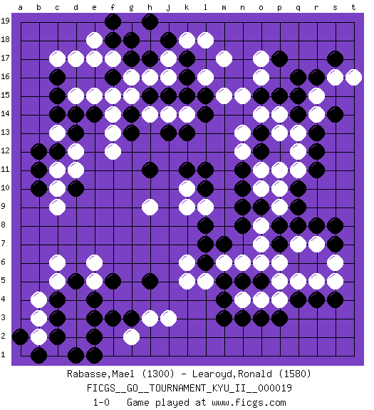 Last move : 1-0 2010 July 14 23:58:33 [Event "FICGS__GO__TOURNAMENT_KYU_II__000019"] [Site "FICGS"] [Date "2010.03.28"] [Round "1"] [Black "Rabasse,Mael"] [White "Learoyd,Ronald"] [Result "1-0"] [Rating 1 "1300"] [Rating 2 "1580"] 1.q16 d4 2.q4 d17 3.c15 d12 4.f16 d15 5.d14 e15 6.e14 f15 7.c16 e17 8.k17 c17 9.d10 f12 10.c12 c13 11.d13 c11 12.b12 d11 13.b11 c10 14.b10 c9 15.q10 f14 16.c14 g16 17.f3 j3 18.c3 d3 19.c4 c5 20.c2 d2 21.d5 c6 22.e4 c1 23.e2 b2 24.e3 d1 25.b1 a1 26.e1 b4 27.b1 b3 28.n3 o17 29.p17 o16 30.q14 m17 31.k15 l16 32.g17 h16 33.h17 j16 34.k16 n13 35.k13 f17 36.k11 j17 37.j18 h18 38.g18 k18 39.h19 l18 40.f18 e18 41.f19 q13 42.r13 q12 43.r12 q11 44.r11 p10 45.q9 p9 46.o12 p13 47.o13 p14 48.p15 o14 49.p8 o8 50.o9 o10 51.n9 o7 52.n10 o11 53.n11 p11 54.o15 n15 55.p7 n12 56.m7 o6 57.m5 p6 58.r8 k9 59.l10 k10 60.l11 p4 61.p3 o4 62.o3 q5 63.r4 r5 64.s4 q7 65.q8 r7 66.s7 s6 67.s8 s5 68.o5 n6 69.n5 r14 70.q15 r15 71.r16 s16 72.s17 t16 73.s14 k14 74.l14 j14 75.l15 m15 76.j13 m6 77.l6 l5 78.l8 n4 79.m4 p5 80.m3 k6 81.l7 l9 82.n8 k5 83.h11 h9 84.g13 f13 85.j15 h14 86.h15 g15 87.g14 g2 88.a2 c1 89.d1 e5 90.g3 h3 91.f5 e6 92.h5 1-0 Here are the names of the openings (joseki) played in the four corners : Corner d16 : d17 c15 Komoku (Somok, Xiao~mu`) 3-4 Point. The komoku (3-4) point is the traditional corner enclosure move.. Ikken Kakari (Hankan Keolch'im, Yi Gua`jiao~, 1-Space Low Pincer). The small knight move is the basic approach move to the 3-4 point stone. It has been continually used for over four centuries. There are limitless variations, with new moves constantly being discovered. Black 2 opens the door to a treaure store of joseki. Corner q16 : q16 o17 Hoshi (Hwajeom, Seongjeom, Xingwei`) 4-4 Point. The star or hoshi (4-4) point, emphasizing influence at the potential expense of territory. Ikken Kakari (Hankan Keolch'im, Yi Gua`jiao~, 1-Space Low Approach). White 2 is the standard approach move to the 4-4. Player Black won this Go (weiqi, baduk) game. Follow this game move after move (download)For rectangular six in the corner, dame is necessary. (Anonymous) The message for business people contemplating their place in the cyberspace is simple and direct: get linked or get lost. (Vic Sussman and Kenan Pollack)