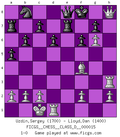 Last move : 1-0 2006 November 3 23:58:55 [Event "FICGS__CHESS__CLASS_D__000015"] [Site "FICGS"] [Date "2006.10.23"] [Round "1"] [White "Uzdin,Sergey"] [Black "Lloyd,Dan"] [Result "1-0"] [WhiteElo "1700"] [BlackElo "1400"] 1.e4 e5 2.Nf3 d6 3.d4 exd4 4.Nxd4 Nf6 5.Nc3 Be7 6.Bf4 b6 7.Qd2 O-O 8.O-O-O Bb7 9.Nf5 Nxe4 10.Nxe4 Bxe4 11.Nxe7+ Kh8 12.Nd5 Bxd5 13.Qxd5 Nd7 14.Bb5 Nf6 15.Qf3 a5 16.Bc6 Ra7 17.g4 Nd7 18.g5 Re8 19.Rhg1 Re7 20.Rg3 Nb8 21.Be4 Qe8 22.Bxh7 Kxh7 23.Qh5+ Kg8 24.Rh3 f6 25.g6 Kf8 26.Qh8+ 1-0 Philidor : Exchange variation Kingside Castling by player Black (move 7) Queenside Castling by player White (move 8) Player White won this chess game. Follow this game move after move (download)Fischer sacrificed virtually everything most of us weakies (to use his term) value, respect, and cherish, for the sake of an artful, often beautiful board game, for the ambivalent privilege of being its greatest master. (Paul Kollar) Der Bart als Geschlechtszeichen mitten im Gesicht ist obszön. Daher gefällt er den Weibern. [Zugegeben, kein Schachzitat, aber unglaublich originell] (Arthur Schopenhauer) Cuando le juegas a Fischer, no es una cuestion de si vas a ganar o perder. Es una cuestion de si vas a sobrevivir. (Boris Spassky) Tous ces prétendus hommes politiques sont les pions, les Cavaliers, les Tours ou les Fous d'une partie d'échecs qui se jouera tant qu'un hasard ne renversera pas l'échiquier. (Honoré de Balzac) I'll be back. (Arnold Schwarzenegger)