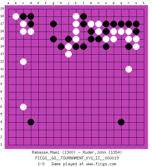 Last move : 1-0 2010 June 3 8:56:29 [Event "FICGS__GO__TOURNAMENT_KYU_II__000019 "] [Site "FICGS"] [Date "2010.03.28"] [Round "1"] [Black "Rabasse,Mael "] [White "Ruder,John "] [Result "1-0"] [Rating 1 "1300"] [Rating 2 "1354"] 1.q4 d16 2.d4 q16 3.r14 r11 4.r17 r16 5.q17 p16 6.s16 s15 7.s17 r15 8.o17 c6 9.o16 o15 10.n15 n16 11.o14 p15 12.m16 n17 13.p17 s14 14.m15 m17 15.l17 k17 16.l18 k16 17.g17 k18 18.d18 c17 19.c18 b18 20.d17 c16 21.g15 c12 22.k14 j14 23.j15 k15 24.h14 j13 25.l14 1-0 This go game has been lost on time (started : 2010.03.28 3:8:34) Here are the names of the openings (joseki) played in the four corners : Corner q16 : q16 r14Hoshi (Hwajeom, Seongjeom, Xingwei`) 4-4 Point. The star or hoshi (4-4) point, emphasizing influence at the potential expense of territory.Ikken Kakari (Hankan Keolch'im, Yi Gua`jiao~, 1-Space Low Approach). Black 2 is the standard approach move to the 4-4. Corner d4 : d4 c6Hoshi (Hwajeom, Seongjeom, Xingwei`) 4-4 Point. The star or hoshi (4-4) point, emphasizing influence at the potential expense of territory.Ikken Kakari (Hankan Keolch'im, Yi Gua`jiao~, 1-Space Low Approach). White 2 is the standard approach move to the 4-4. Corner d16 : d16 g17Hoshi (Hwajeom, Seongjeom, Xingwei`) 4-4 Point. The star or hoshi (4-4) point, emphasizing influence at the potential expense of territory.Niken Kakari (Dukan Keolch'im, E`r Gua`jiao~, 2-Space Low Approach). White typically answers by 7-3 or 3-5 (which is not joseki). Corner q4 : q4 1-0Hoshi (Hwajeom, Seongjeom, Xingwei`) 4-4 Point. The star or hoshi (4-4) point, emphasizing influence at the potential expense of territory. Player Black won this Go (weiqi, baduk) game.Follow this game move after move (download ) There is no territory in the centre. (Anonymous) Luck is when opportunity knocks and you answer. (Anonymous)