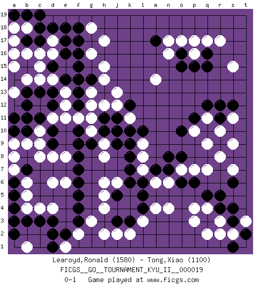 Last move : 0-1 2010 May 9 13:28:26 [Event "FICGS__GO__TOURNAMENT_KYU_II__000019"] [Site "FICGS"] [Date "2010.03.28"] [Round "1"] [Black "Learoyd,Ronald"] [White "Tong,Xiao"] [Result "0-1"] [Rating 1 "1580"] [Rating 2 "1100"] 1.q16 d4 2.q3 d16 3.r9 n4 4.l4 q4 5.r4 r3 6.q5 p4 7.r5 p3 8.s3 q2 9.o6 n6 10.n7 m6 11.f3 h4 12.f5 d6 13.d2 g3 14.f4 h6 15.f7 d8 16.c3 c4 17.f17 d14 18.d18 d11 19.j5 h5 20.k7 h8 21.m7 f2 22.e2 h2 23.d3 l7 24.l6 l8 25.l5 m4 26.k8 l9 27.k9 o7 28.o8 p7 29.p6 q7 30.n8 q9 31.o10 r8 32.q10 r10 33.r11 s9 34.l10 s2 35.s4 s11 36.r12 p10 37.p11 q11 38.q12 o17 39.m17 q17 40.o16 p16 41.p15 p17 42.q15 n16 43.o15 n17 44.f9 l3 45.k3 k2 46.j3 j2 47.d9 c9 48.d10 c10 49.c11 e11 50.f10 c12 51.b11 c8 52.d12 e12 53.d13 e13 54.c13 c14 55.b13 b14 56.a14 b16 57.b10 b9 58.a10 a12 59.b12 a13 60.a11 a13 61.s6 s7 62.t2 t3 63.s12 h17 64.c17 b18 65.f15 g16 66.f16 g13 67.e14 a15 68.f13 g12 69.f12 f11 70.f14 g10 71.b17 a17 72.c18 c16 73.b19 a18 74.e18 g18 75.c19 h15 76.e16 d17 77.f18 a9 78.e17 e8 79.f8 b4 80.b3 e1 81.d1 a3 82.g9 h9 83.h10 g11 84.g14 h14 85.h13 j10 86.h11 h12 87.j11 j13 88.j9 k11 89.k10 j12 90.j10 j6 91.k6 m14 92.a19 a16 93.d15 c15 94.a2 b1 95.a4 b6 96.a6 a7 97.a5 b5 98.a3 e6 99.f6 r17 100.k12 s15 101.s1 r2 102.b7 a8 0-1 Here are the names of the openings (joseki) played in the four corners : Corner d4 : d4 f3 Hoshi (Hwajeom, Seongjeom, Xingwei`) 4-4 Point. The star or hoshi (4-4) point, emphasizing influence at the potential expense of territory. Ikken Kakari (Hankan Keolch'im, Yi Gua`jiao~, 1-Space Low Approach). Black 2 is the standard approach move to the 4-4. Corner d16 : d16 f17 Hoshi (Hwajeom, Seongjeom, Xingwei`) 4-4 Point. The star or hoshi (4-4) point, emphasizing influence at the potential expense of territory. Ikken Kakari (Hankan Keolch'im, Yi Gua`jiao~, 1-Space Low Approach). Black 2 is the standard approach move to the 4-4. Player White won this Go (weiqi, baduk) game. Follow this game move after move (download)The simplest move is the best move. (Anonymous) Experience is the name we all give to our mistakes. (Oscar Wilde)