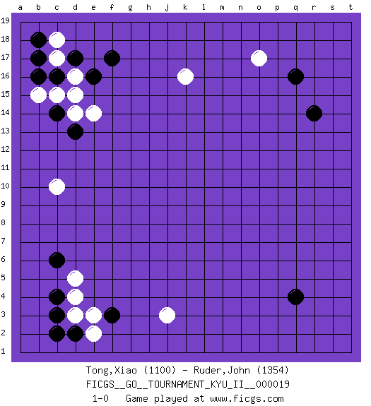 Last move : 1-0 2010 May 19 20:26:39 [Event "FICGS__GO__TOURNAMENT_KYU_II__000019 "] [Site "FICGS"] [Date "2010.03.28"] [Round "1"] [Black "Tong,Xiao "] [White "Ruder,John "] [Result "1-0"] [Rating 1 "1100"] [Rating 2 "1354"] 1.q16 d4 2.q4 d16 3.f3 j3 4.c3 d3 5.c4 d5 6.d2 e2 7.c2 e3 8.c6 o17 9.r14 k16 10.c14 c10 11.f17 d14 12.d13 e14 13.c16 c17 14.d17 c15 15.b16 b15 16.e16 d15 17.b17 c18 18.b18 1-0 This go game has been lost on time (started : 2010.03.28 3:8:34) Here are the names of the openings (joseki) played in the four corners : Corner d4 : d4 f3Hoshi (Hwajeom, Seongjeom, Xingwei`) 4-4 Point. The star or hoshi (4-4) point, emphasizing influence at the potential expense of territory.Ikken Kakari (Hankan Keolch'im, Yi Gua`jiao~, 1-Space Low Approach). Black 2 is the standard approach move to the 4-4. Corner q16 : q16 o17Hoshi (Hwajeom, Seongjeom, Xingwei`) 4-4 Point. The star or hoshi (4-4) point, emphasizing influence at the potential expense of territory.Ikken Kakari (Hankan Keolch'im, Yi Gua`jiao~, 1-Space Low Approach). White 2 is the standard approach move to the 4-4. Corner d16 : d16 c14Hoshi (Hwajeom, Seongjeom, Xingwei`) 4-4 Point. The star or hoshi (4-4) point, emphasizing influence at the potential expense of territory.Ikken Kakari (Hankan Keolch'im, Yi Gua`jiao~, 1-Space Low Approach). Black 2 is the standard approach move to the 4-4. Player Black won this Go (weiqi, baduk) game.Follow this game move after move (download ) The carpenter's square becomes ko. (Anonymous) 98% of all statistics are made up. (Author unknown)