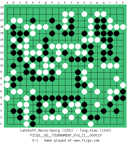 Last move : 0-1 2010 June 5 16:35:58 [Event "FICGS__GO__TOURNAMENT_KYU_II__000019"] [Site "FICGS"] [Date "2010.03.28"] [Round "1"] [Black "Lehnhoff,Heinz-Georg"] [White "Tong,Xiao"] [Result "0-1"] [Rating 1 "1331"] [Rating 2 "1100"] 1.q16 d4 2.q3 d16 3.f3 c6 4.k4 r6 5.r4 q10 6.r12 p6 7.n4 k17 8.c14 f16 9.b16 c17 10.c11 o17 11.p17 o16 12.r14 q13 13.r13 q15 14.r15 r17 15.q12 p18 16.p15 o10 17.c3 d3 18.f5 c4 19.c8 g4 20.f4 k3 21.l3 j4 22.h5 j2 23.j5 l2 24.k5 m3 25.n3 l4 26.l5 m4 27.g5 d12 28.c12 d14 29.m5 n2 30.c2 d2 31.e2 d1 32.b7 n14 33.o12 n12 34.o2 c13 35.b13 d13 36.c15 b14 37.b12 e10 38.l16 k16 39.l15 l13 40.h11 h13 41.k15 j13 42.l17 n18 43.h9 s10 44.s5 s6 45.n11 m12 46.m9 o1 47.p2 b17 48.m7 n8 49.m8 s16 50.s15 b6 51.a6 a5 52.t6 t7 53.t5 s8 54.f11 d11 55.e8 b9 56.d9 a7 57.d15 e15 58.b15 f9 59.f8 g9 60.g8 h10 61.j10 g10 62.l11 j9 63.h15 l18 64.j16 k18 65.g14 j11 66.h8 k10 67.h17 g16 68.n15 o15 69.p16 p14 70.q14 r16 71.m11 n6 72.n7 o7 73.q11 r10 74.o13 o14 75.k12 k13 76.n13 m13 77.o11 n9 78.d10 j12 79.e11 f13 80.g13 g11 81.g12 f12 82.e9 e12 83.s11 a16 84.q17 q18 85.q15 t16 86.e1 g2 87.h3 h2 88.e17 e16 89.b3 e6 90.b8 a8 91.b10 r5 92.s3 p4 93.e5 d5 0-1 Here are the names of the openings (joseki) played in the four corners : Corner d4 : d4 f3 Hoshi (Hwajeom, Seongjeom, Xingwei`) 4-4 Point. The star or hoshi (4-4) point, emphasizing influence at the potential expense of territory. Ikken Kakari (Hankan Keolch'im, Yi Gua`jiao~, 1-Space Low Approach). Black 2 is the standard approach move to the 4-4. Corner q4 : q3 r6 Komoku (Somok, Xiao~mu`) 3-4 Point. The komoku (3-4) point is the traditional corner enclosure move.. Niken Kakari (Dukan Keolch'im, E`r Gua`jiao~, 2-Space Low Approach). White 2 is used with friendly forces backing it up. Its purpose is to prevent a pincer. Locally it results in a loss, but may be appropriate fuseki strategy. It was popular in the late 1950s and early 1960s, but is not seen often nowadays, having been replaced by the one-space high approach, with which it has points in common. Corner d16 : d16 c14 Hoshi (Hwajeom, Seongjeom, Xingwei`) 4-4 Point. The star or hoshi (4-4) point, emphasizing influence at the potential expense of territory. Ikken Kakari (Hankan Keolch'im, Yi Gua`jiao~, 1-Space Low Approach). Black 2 is the standard approach move to the 4-4. Player White won this Go (weiqi, baduk) game. Follow this game move after move (download)Don't try to enclose an open skirt. (Anonymous) Life is like a game of cards: the hand you are dealt represents determinism; the way you play it is free will. (Jawaharlal Nehru)