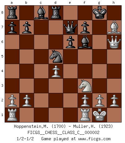 Last move : 1/2-1/2 2006 April 30 22:1:30 [Event "FICGS__CHESS__CLASS_C__000002"] [Site "FICGS"] [Date "2006.04.26"] [Round "1"] [White "Hoppenstein,Michael"] [Black "Muller,Henri-Louis"] [Result "1/2-1/2"] [WhiteElo "1700"] [BlackElo "1923"] 1.d4 Nf6 2.Nf3 d5 3.e3 e6 4.Bd3 c5 5.c3 Nc6 6.O-O Bd6 7.Nbd2 O-O 8.e4 cxd4 9.cxd4 dxe4 10.Nxe4 Be7 11.Nxf6+ Bxf6 12.Be3 Nb4 13.Be4 Nd5 14.Qc2 h6 15.Qd2 Qe7 16.Bxh6 gxh6 17.Qxh6 Rd8 18.Bh7+ Kh8 19.Bg6 Kg8 20.Bh7+ 1/2-1/2 Queen's pawn game Kingside Castling by player White (move 6) Kingside Castling by player Black (move 7) This chess game ended in a draw. Follow this game move after move (download)Chess is thirty to forty percent psychology. You don't have this when you play a computer. I can't confuse it. (Judith Polgar) Du kannst im Schach nur gut werden, wenn du das Spiel liebst. (Robert James Fischer) Solo los afeminados hacen el Enroque. (Rob Sillars) Les échecs sont un jeu par leur forme, un art par leur essence et une science par sa difficulté d'acquisition. Ils peuvent vous procurer autant de plaisir qu'un bon livre ou une belle musique, mais vous n'aurez une réelle joie que si vous arrivez à bien jouer. (Tigran Petrosian) Good decisions come from experience, and experience comes from bad decisions. (Anonymous)