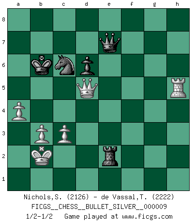 Last move : 1/2-1/2 2010 March 28 17:53:41 [Event "FICGS__CHESS__BULLET_SILVER__000009"] [Site "FICGS"] [Date "2010.03.28"] [Round "1"] [White "Nichols,Scott"] [Black "de Vassal,Thibault"] [Result "1/2-1/2"] [WhiteElo "2126"] [BlackElo "2222"] 1.e4 c5 2.Nf3 d6 3.d4 cxd4 4.Nxd4 Nf6 5.Nc3 a6 6.Bg5 e6 7.f4 Nbd7 8.Qf3 Qc7 9.O-O-O b5 10.Bd3 Bb7 11.Rhe1 Be7 12.Qg3 b4 13.Nd5 exd5 14.exd5 Kd8 15.Nc6+ Bxc6 16.dxc6 Nc5 17.Bh4 Rg8 18.Bf5 a5 19.Re2 Qxc6 20.Bxh7 Re8 21.Rxe7 Rxe7 22.Qxg7 Nxh7 23.Qxf7 R8a7 24.Qxh7 Qe4 25.Qg8+ Kd7 26.Bxe7 Qxf4+ 27.Kb1 Kxe7 28.h4 Nd7 29.Qg7+ Qf7 30.Qg5+ Ke8 31.h5 Ne5 32.h6 Rd7 33.g4 a4 34.b3 a3 35.Qe3 Kf8 36.h7 Qxh7 37.Qf4+ Ke8 38.Qxb4 Rc7 39.Qa4+ Kd8 40.Qa8+ Ke7 41.Rc1 Nxg4 42.Qb8 Rd7 43.Qb4 Qf5 44.Qxa3 Rc7 45.Re1+ Ne5 46.Qc1 Kd7 47.Re2 Rc5 48.Qe3 Nc6 49.Kb2 Re5 50.Qd2 Kc7 51.a4 Qe6 52.Rh2 Re3 53.Rh7+ Kb6 54.Rh5 Qf6+ 55.c3 Qe7 56.Qd5 Re2+ 1/2-1/2 Sicilian : Najdorf, 7.f4 Queenside Castling by player White (move 9) This chess game ended in a draw. Follow this game move after move (download)It's always better to sacrifice your opponent's men. (Savielly Tartakover) Der Vorposten provoziert a) eine Basis für neue Angriffe und b) eine Schwächung der gegnerischen Widerstandskraft in der fraglichen Linie. (Aaron Nimzowitsch) Con el fin de mejorar tu juego, debes de estudiar los finales antes que todo, ya que mientras que los finales pueden ser estudiados y dominados por sí mismos, el juegomedio y la apertura deben de ser estudiados en relación con los finales. (José Raúl Capablanca) Il n'y a plus de joueurs du niveau de Jacob Murray dont la seule quête est le beau jeu, le plaisir de voir les pièces construire quelque chose. Sur 10 idées à la minute, 9 seront sans intérêt, la dernière s'avèrera géniale. (Christian Bauer) He who defends everything defends nothing. (Frederick the Great)