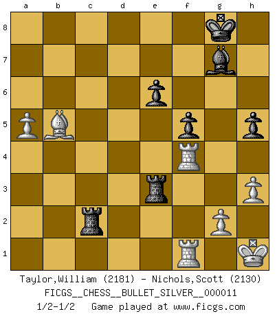 Last move : 1/2-1/2 2010 March 28 19:30:24 [Event "FICGS__CHESS__BULLET_SILVER__000011"] [Site "FICGS"] [Date "2010.03.28"] [Round "1"] [White "Taylor,William"] [Black "Nichols,Scott"] [Result "1/2-1/2"] [WhiteElo "2181"] [BlackElo "2130"] 1.e4 e6 2.d4 d5 3.Nc3 dxe4 4.Nxe4 Nd7 5.Nf3 Ngf6 6.Bg5 h6 7.Nxf6+ Nxf6 8.Bh4 c5 9.Bc4 cxd4 10.O-O Be7 11.Qe2 O-O 12.Rad1 Qb6 13.Nxd4 Qxb2 14.Nf5 Bd8 15.Rb1 Qc3 16.Rb3 Qa5 17.Nxh6+ gxh6 18.Rg3+ Kh8 19.Rd1 Bd7 20.Bxf6+ Bxf6 21.Rxd7 Rad8 22.Rxb7 Rd2 23.Qe3 Bg7 24.Bf1 Rxc2 25.Rxa7 Qd5 26.Ra4 Rfc8 27.Rh4 Qd2 28.Rhg4 Qxe3 29.fxe3 Bf6 30.a4 Ra2 31.Rh3 Bg7 32.Rf3 Rc7 33.Re4 Kg8 34.Rb4 Ra3 35.Rh4 h5 36.h3 Rc5 37.Rhf4 f5 38.Bc4 Rc6 39.Bb5 Rc1+ 40.Rf1 Rc2 41.Kh1 Rxe3 42.a5 1/2-1/2 French : Rubinstein variation Kingside Castling by player White (move 10) Kingside Castling by player Black (move 11) This chess game ended in a draw. Follow this game move after move (download)Chess is 99 percent tactics. (Teichmann) Mein erstes Ziel war nicht, die Partie zu gewinnen, sondern eine Figur zu opfern. -- der junge (Wilhelm Steinitz) Observen a Garry Kasparov. Después de una derrota, invariablemente el gana la próxima partida. Prácticamente hace pedazos a su siguiente oponente. Eso es algo que tenemos que aprender a lograr. (Maurice Ashley) Je menace de comprendre la position. (Anonyme) If everyone is thinking alike, then somebody isn't thinking. (US General George S. Patton)