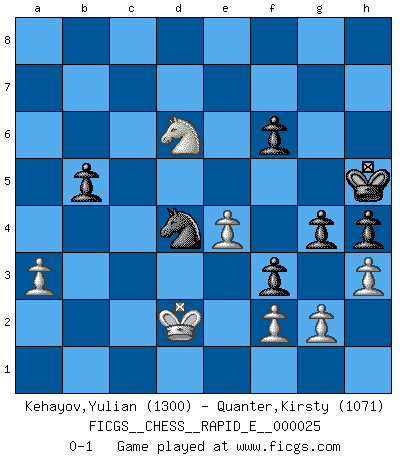 Last move : 0-1 2010 April 19 11:51:46 [Event "FICGS__CHESS__RAPID_E__000025"] [Site "FICGS"] [Date "2010.03.28"] [Round "1"] [White "Kehayov,Yulian"] [Black "Quanter,Kirsty"] [Result "0-1"] [WhiteElo "1300"] [BlackElo "1071"] 1.e4 c5 2.d4 b6 3.Be3 cxd4 4.Qxd4 Ba6 5.Bxa6 Nxa6 6.Nf3 f6 7.O-O e5 8.Qc4 Nc5 9.b4 Ne6 10.Qe2 Bxb4 11.c3 Ba5 12.Qc2 g5 13.Nbd2 Rc8 14.c4 Bxd2 15.Qxd2 Rxc4 16.Rad1 Ne7 17.Qd3 Ra4 18.Rd2 h5 19.Rfd1 Nf8 20.Qd6 Nc8 21.Qb8 h4 22.Rc1 Rb4 23.h3 Ne7 24.Qxa7 Nfg6 25.Rcd1 Nc8 26.Qxd7+ Qxd7 27.Rxd7 O-O 28.Rd8 Rb2 29.Rxf8+ Nxf8 30.Rd8 Na7 31.Rd2 Rxd2 32.Bxd2 b5 33.a3 Nc6 34.Nh2 Ne6 35.Ng4 Kg7 36.Ne3 Nf4 37.Nf5+ Kg6 38.Nd6 Nd4 39.Kf1 Kh5 40.Bxf4 exf4 41.Ke1 g4 42.Kd2 f3 0-1 Sicilian : Smith-Morra gambit Kingside Castling by player White (move 7) Kingside Castling by player Black (move 27) Player Black won this chess game. Follow this game move after move (download)If I win a tournament, I win it by myself. I do the playing. Nobody helps me. (Bobby Fischer) Wenn ich einen Club besuche, sind die Spieler stumm vor Staunen. (José Raúl Capablanca) Los libros de Ajedrez deben de usarse igual como usamos los anteojos: para mejorar la vista, aunque algunos jugadores los quieren usar como si ellos les otorgaran la vision. (José Raúl Capablanca) On a dit que l'homme se distingue de l'animal par le fait qu'il achète plus de livres qu'il ne peut en lire. Je voudrais suggérer qu'inclure à la liste des livres quelques livres d'échecs rendrait la distinction manifeste. (Edward Lasker) It's not the size of the dog in the fight, it's the size of the fight in the dog. (Mark Twain)
