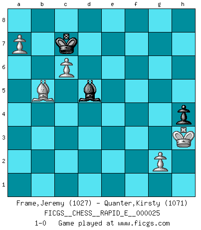 Last move : 1-0 2010 April 20 9:30:18 [Event "FICGS__CHESS__RAPID_E__000025"] [Site "FICGS"] [Date "2010.03.28"] [Round "1"] [White "Frame,Jeremy"] [Black "Quanter,Kirsty"] [Result "1-0"] [WhiteElo "1027"] [BlackElo "1071"] 1.e4 e5 2.Nf3 Nc6 3.Nc3 Nf6 4.Bc4 a6 5.O-O b5 6.Bb3 Bb4 7.d3 d5 8.exd5 Nd4 9.Nxd4 exd4 10.Ne4 O-O 11.Bd2 Bxd2 12.Qxd2 Bf5 13.Nxf6+ Qxf6 14.c3 dxc3 15.bxc3 Rfe8 16.Rae1 Rxe1 17.Rxe1 Bd7 18.c4 bxc4 19.dxc4 Re8 20.Rxe8+ Bxe8 21.h3 c6 22.d6 Bd7 23.c5 g5 24.Qe3 h5 25.a4 Kg7 26.Bc4 Bc8 27.Qe7 Qxe7 28.dxe7 Bd7 29.Bxa6 Kf6 30.Bc8 Kxe7 31.Bb7 Kd8 32.a5 Kc7 33.a6 Kb8 34.f3 f5 35.Kf2 g4 36.fxg4 fxg4 37.hxg4 Bxg4 38.Bxc6 Bc8 39.Bb5 Bf5 40.Kg3 Be4 41.c6 Bd5 42.Kh2 h4 43.Kh3 Kc7 44.a7 1-0 Four knights : Italian variation Kingside Castling by player White (move 5) Kingside Castling by player Black (move 10) 10 pieces endgame at move 37 : White KBPPPP , Black KBPP WHITE : King + 1 Bishop 4 Pawns BLACK : King + 1 Bishop 2 Pawns 9 pieces endgame at move 37 : White KBPPP , Black KBPP WHITE : King + 1 Bishop 3 Pawns BLACK : King + 1 Bishop 2 Pawns 8 pieces endgame at move 38 : White KBPPP , Black KBP WHITE : King + 1 Bishop 3 Pawns BLACK : King + 1 Bishop 1 Pawn Player White won this chess game. Follow this game move after move (download)Chess is ruthless: you've got to be prepared to kill people. (Nigel Short) Wenn du nicht weißt was du tun sollst, warte bis dein Gegner eine Idee hat. Sie wird sicher schlecht sein. (Siegbert Tarrasch) Un buen sacrificio es aquel que aunque no sea necesariamente sólido, deja a tu oponente aturdido y confuso. (Rudolph Spielmann) Les échecs sont un jeu terrible. Si vous n'avez pas le centre, votre adversaire a une position plus libre. Par contre, si vous avez le centre, alors vous avez vraiment quelque chose pour laquelle vous inquiéter ! (Siegbert Tarrasch) If things go wrong, don't go with them. (Roger Babson)