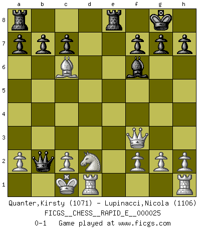 Last move : 0-1 2010 April 12 23:17:23 [Event "FICGS__CHESS__RAPID_E__000025"] [Site "FICGS"] [Date "2010.03.28"] [Round "1"] [White "Quanter,Kirsty"] [Black "Lupinacci,Nicola"] [Result "0-1"] [WhiteElo "1071"] [BlackElo "1106"] 1.e4 e5 2.Nf3 Nf6 3.d3 d5 4.Nxe5 dxe4 5.Bg5 Be7 6.Nd2 exd3 7.Bxd3 Nbd7 8.Nxd7 Bxd7 9.Qe2 O-O 10.Bxf6 Bxf6 11.O-O-O Re8 12.Qf3 Bc6 13.Be4 Qd4 14.Bxc6 Qxb2+ 0-1 Petrov's defense Kingside Castling by player Black (move 9) Queenside Castling by player White (move 11) Player Black won this chess game. Follow this game move after move (download)Dazzling combinations are for the many, shifting wood is for the few. (Georg Kieninger) Schach ist das Spiel, das die Verrückten gesund hält. (Albert Einstein) Mi estilo es algo parecido entre un poco de Tal y Petrosian. (Reshevsky) Il n'y a pas eu de défaite parce que je ne crois pas que cet ordinateur ait jamais existé. IBM a triché en refusant d'imprimer les modes de recherche de la machine. C'est évident, pendant le match, des coups décisifs ont été joués par des êtres humains. Aujourd'hui, les meilleurs spécialistes en informatique ne peuvent toujours pas expliquer comment Deep-Blue a pu jouer contre la logique des ordinateurs. IBM a gagné une guerre de communication, mais ils sont incapables de prouver que l'ordinateur a gagné tout seul. (Garry Kasparov) Games, world of games... There's always an opponent, and there's always a victim. (Revolver, movie)